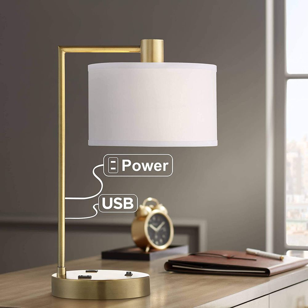 Produto importado dos Estados Unidos o prazo de entrega e de ate 25 dias uteis As importacoes sao oficiais atraves do Regime de Tributacao Simplificada da Receita Federal O preco inclui imposto de Importacao ICMS Frete Nacional Frete Internacional Servicos Alfandegarios e a intermediacao de cambio para pagamento no exterior O preco ja inclui todos os custos nao sera cobrado nenhum valor extra para o recebimento do produto ATENCAO Todos os produtos eletricos sao 110V e necessitam de adaptador para a tomada no formato brasileiro Usa uma lampada de base media padrao maxima de 150 watts nao incluida Interruptor ligadesliga na base A base tem uma tomada embutida e uma porta USB 20A 2 amperes A porta e a tomada USB funcionam se a luz estiver acesa ou apagada Candeeiro de secretaria USB para estacao de trabalho Um design de lampada moderno da marca 360 Lighting Acabamento em ouro antigo quente Construcao metalica Abajur de tambor nao ajustador de linho branco