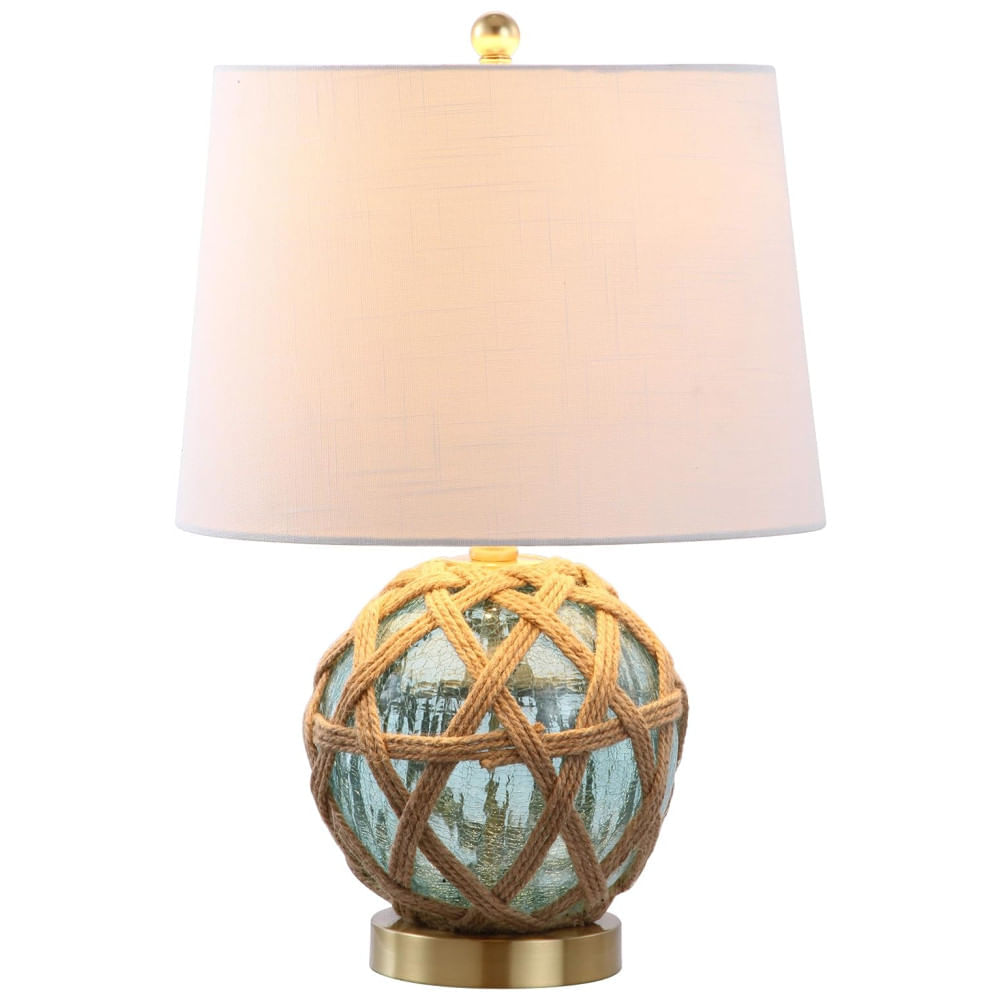Atenção: Todos os produtos elétricos são 110V e necessitam de adaptador para a tomada no formato Brasileiro. Este abajur de mesa em vidro azul água traz um charme costeiro ao seu espaço, com uma rede de corda quente envolvendo o recipiente de vidro, criando uma aparência única. O abajur em tecido branco e o cordão revestido em seda completam o visual sofisticado.