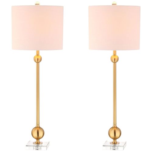 Atenção: Todos os produtos elétricos são 110V e necessitam de adaptador para a tomada no formato Brasileiro. A luminária de mesa JONATHAN Y é uma peça versátil e elegante que combina metal e cristal com uma cúpula clássica de algodão branco. Sua base transparente, inspirada no design Sputnik em latão, adiciona um toque moderno e sofisticado a qualquer ambiente.