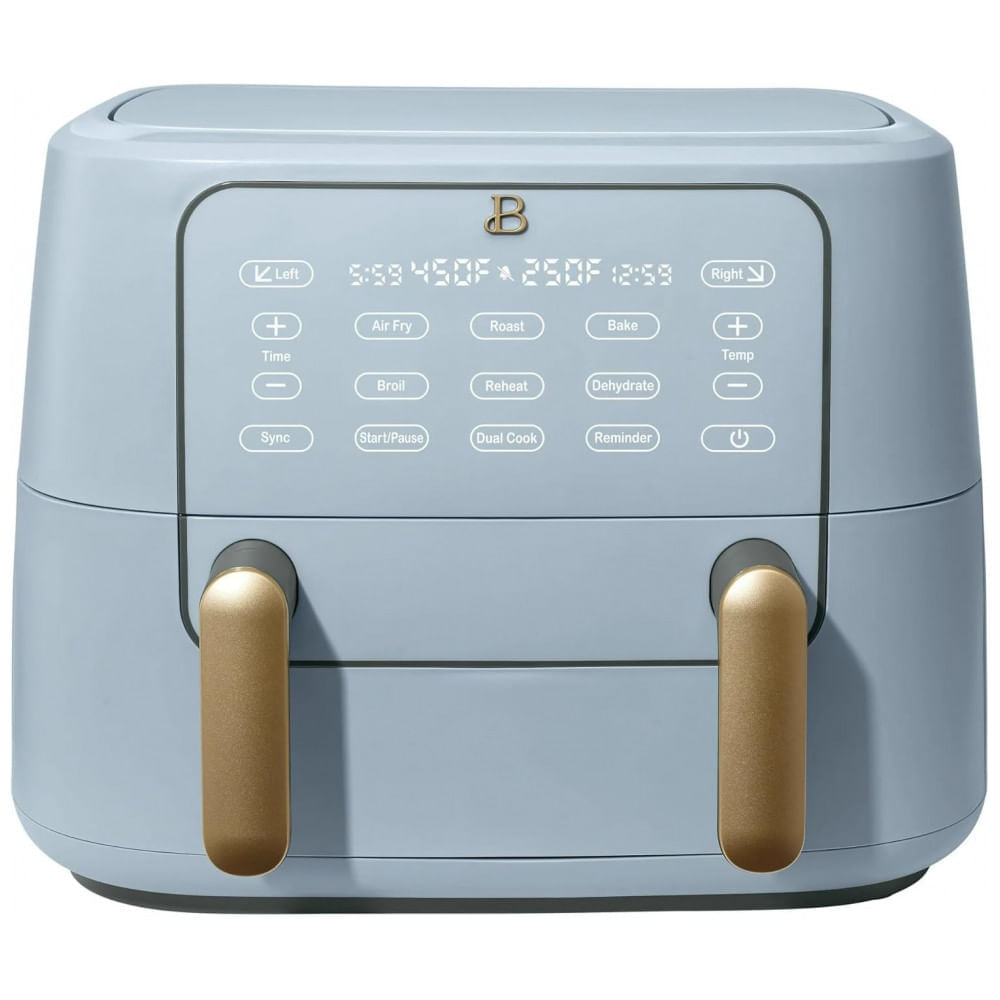 Atenção: Todos os produtos elétricos são 110V e necessitam de adaptador para a tomada no formato Brasileiro. Fritadeira elétrica de ar de 9 litros com sistema de dupla zona independente, permitindo o preparo simultâneo de dois alimentos com tempos e temperaturas diferentes ou o uso de um cesto único de grande capacidade. A estrutura em aço inoxidável e o aquecimento de 1700W garantem circulação de ar quente eficiente para cozimento uniforme em diversos tipos de preparo. ?O painel digital sensível ao toque oferece 6 modos pré-programados para fritar, assar, reaquecer, desidratar, assar em forno e gratinar, com ajuste de temperatura entre 32 °C e 232 °C. A função de sincronização de término permite que as duas zonas concluam o preparo ao mesmo tempo, mantendo os alimentos prontos simultaneamente. O cesto principal de 9 litros pode ser utilizado como um único compartimento ou dividido em duas zonas de 4,5 litros por meio do divisor removível, atendendo preparos de grande volume como aves inteiras ou grandes porções de batatas. Componentes internos, como cesto, divisor central e bandejas crocantes, possuem revestimento antiaderente e são removíveis para limpeza em lava-louças. O design com acabamento fosco facilita a limpeza externa e reduz marcas de uso, enquanto o painel apenas ilumina durante a operação, resultando em visual discreto e moderno na bancada. A fritadeira é adequada para preparo diário de refeições, apoio em rotinas de pré-preparo e uso em cozinhas domésticas que demandam versatilidade com controle técnico de temperatura e tempo. Ficha Técnica: Marca: Beautiful by Drew Barrymore Modelo: 9QT Dual Zone Air Fryer (Special Edition) / 19 0 89? Tipo de produto: Fritadeira elétrica de ar de dupla zona? Capacidade total: 9 litros? Configuração de cestos: 2 zonas de 4,5 litros cada ou 1 cesto único de 9 litros com divisor removível? Cor: Azul Material principal: Aço inoxidável na carcaça e elemento de aquecimento? Potência: 1700W? Voltagem: 110V? Método de controle: Painel digital sensível ao toque? Controlador: Tela touchscreen com comandos integrados? Faixa de temperatura: 32 °C a 232 °C? Funções pré-programadas: Fritar, assar, reaquecer, desidratar, assar em forno, gratinar? Dimensões do produto (Prof. x Larg. x Alt.): 47,5 cm x 36,5 cm x 41,5 cm? Peso do produto: 8,6kg? Zonas de cozimento: 2 zonas independentes com divisor removível? Acessórios inclusos: Cesto principal, divisor central, 2 bandejas crocantes? Componentes laváveis em lava-louças: Cesto, divisor e bandejas crocantes Tipo de instalação: Uso em bancada? Uso recomendado: Fritar por ar quente, assar, reaquecer, desidratar e gratinar alimentos em ambiente doméstico? Manual do usuário: Inglês?