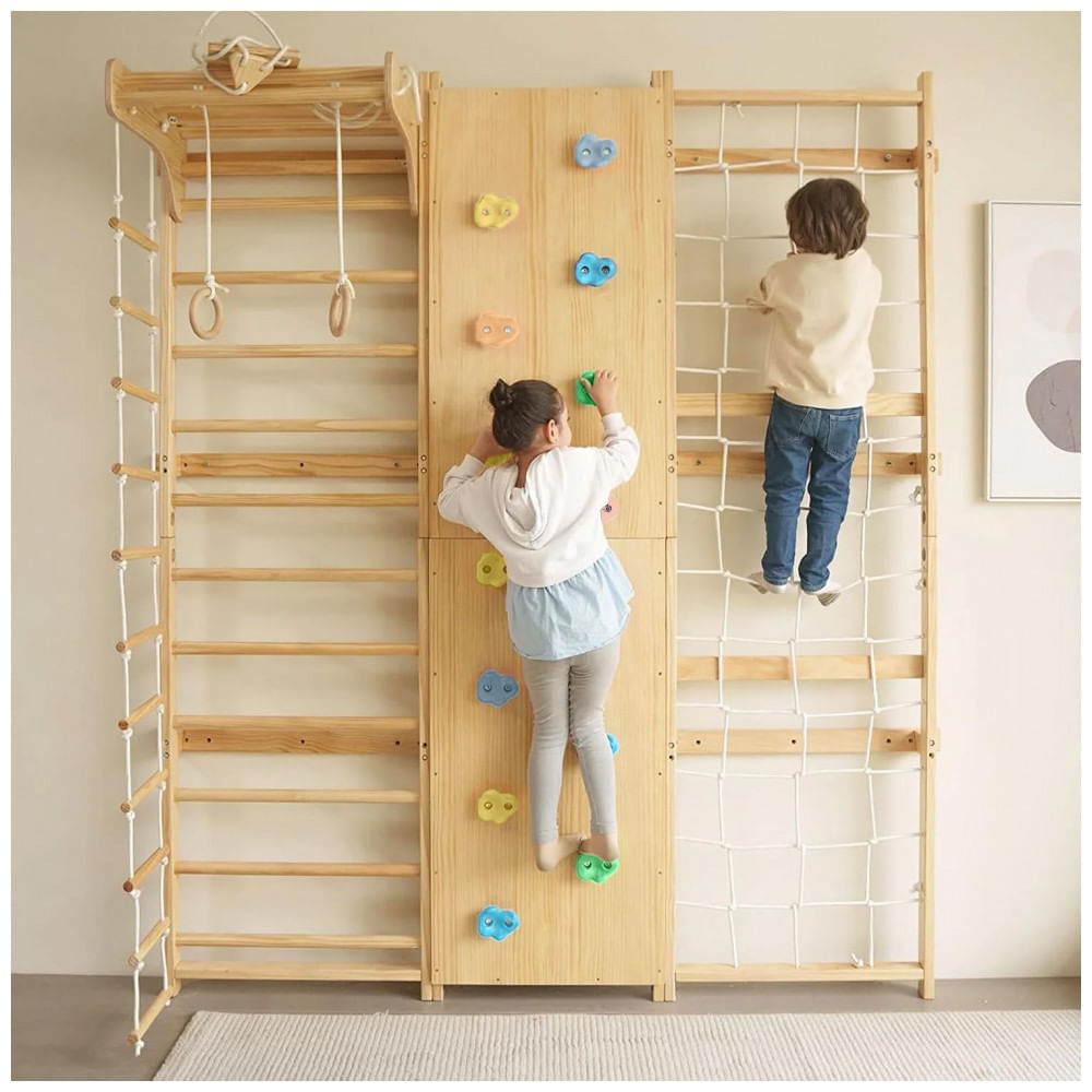 Atenção: Todos os produtos elétricos são 110V e necessitam de adaptador para a tomada no formato Brasileiro. O aparelho ginásio escada sueca 9 em 1 Avenlur Walnut é um equipamento multifuncional de madeira sólida, fabricado com materiais premium como faia e pinho, com acabamento natural que assegura durabilidade e resistência ao uso contínuo. Proporciona dois ajustes de altura (2,40 m e 2,00 m) para se adequar a diferentes espaços internos. O conjunto inclui 9 estações distintas incorporando balanço trapezista, escada de corda, parede de escalada, rampa de escalada, escorregador, barra para puxada, entre outros, colaborando para o desenvolvimento da força, equilíbrio, flexibilidade e coordenação motora. A estrutura foi projetada com degraus arredondados visando oferecer aderência segura e confortável para diversas faixas etárias, priorizando a estabilidade durante o uso. O design é compacto, ideal para otimização de espaço em residências, salas de recreação ou espaços profissionais, facilitando a montagem com o hardware incluso. A capacidade máxima recomendada é de 100 kg por usuário, com limite total de 227 kg para o conjunto de uso simultâneo. Ficha técnica do produto: Marca/Fabricante: Avenlur Material: Madeira sólida de faia e pinho com acabamento natural Dimensões do produto (C x L x A): 196 cm x 65 cm x 200 cm (aproximado para a versão de 2,00 m de altura) Opções de altura: 2,40 m e 2,00 m Capacidade máxima por usuário: 100 kg Capacidade total de carga: 227 kg Componentes incluídos: balanço trapezista, escada de corda, parede de escalada, rampa de escalada, escorregador, barra para puxada, entre outros Peso do produto: aproximadamente 40 kg Instalação: Requer montagem; hardware incluído Cor:Madeira