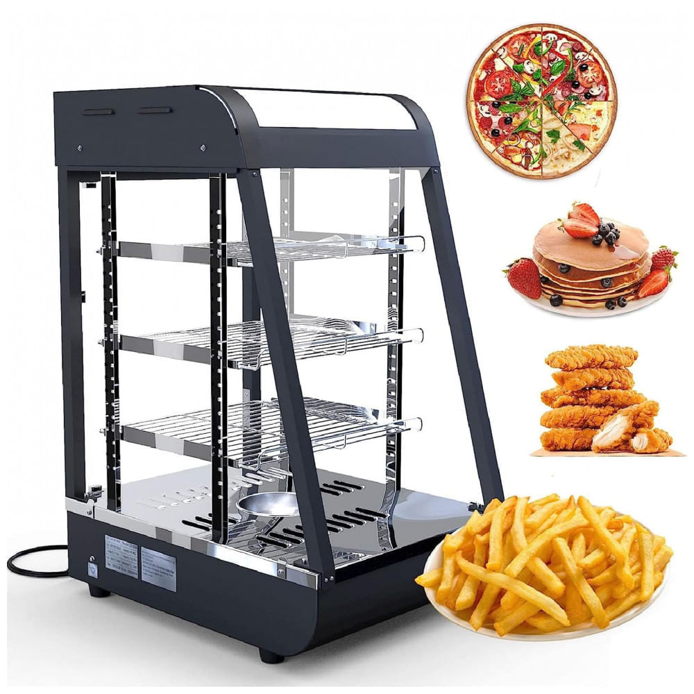 Atenção: Todos os produtos elétricos são 110V e necessitam de adaptador para a tomada no formato Brasileiro. O Aquecedor de Alimentos 2 Andares Commercial é um expositor countertop projetado para cozinhas profissionais, com corpo em aço inoxidável anticorrosivo e porta de vidro curvo temperado para visualização clara de conteúdos. Oferece 2 prateleiras em material food-grade com volume interno de 42,5 L, suportando itens como pizzas, tortas de ovo e hambúrgueres em configurações ajustáveis. O termostato homogêneo permite controle preciso na faixa de 30°C a 85°C, garantindo distribuição uniforme de calor. ? As portas deslizantes de vidro facilitam autoatendimento e reabastecimento simultâneos, otimizando operação em restaurantes, cafeterias e fast-foods. A iluminação LED independente realça a apresentação, com interruptor separado do sistema de aquecimento de 800W. Construção compacta com pés antiderrapantes assegura estabilidade em bancadas limitadas. Versátil para catering e buffets, o design inclui tampa de vidro e manual de instruções para instalação rápida em redes 110V. Ficha Técnica Especificação Detalhes Marca Commercial Cor Preto Material Aço inoxidável, vidro temperado Potência 800W Voltagem 110V Dimensões (C x L x A) 38 x 55,6 x 38 cm Peso do item 17 kg Prateleiras 2 food-grade Temperatura 30°C a 85°C Volume interno 42,5 L Recursos Portas deslizantes, LED independente, tampa vidro Inclui Tampa vidro, manual