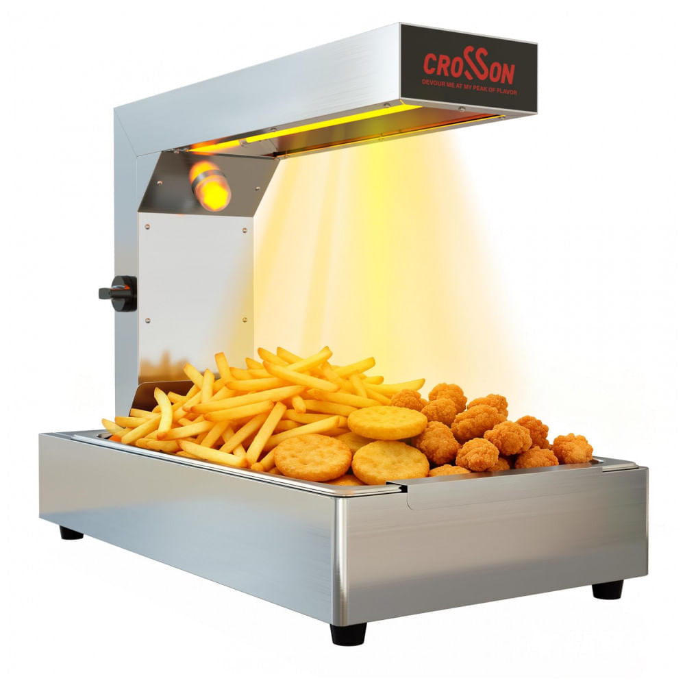 Atenção: Todos os produtos elétricos são 110V e necessitam de adaptador para a tomada no formato Brasileiro. O Aquecedor de Batata Frita CROSSON é um equipamento comercial projetado para manter frituras em temperatura ideal, com estrutura em aço inoxidável resistente e lâmpada térmica de 600W para aquecimento uniforme. Possui 5 níveis de duração de aquecimento ajustáveis: configuração 2 por 5 minutos; configuração 3 por 9 minutos; configuração 4 por 15 minutos. Nas configurações 1 a 4, opera em ciclos intermitentes, desligando automaticamente ao atingir a temperatura pré-definida e religando ao detectar queda, ideal para períodos de baixa demanda. A configuração 5 mantém aquecimento contínuo sem ciclos, otimizada para horários de pico. O elemento de aquecimento de 600W garante distribuição uniforme de calor, preservando a textura crocante de itens como batatas fritas e frango frito. Inclui filtro de malha removível para óleo e bandeja de gotejamento que direciona excesso de óleo para recipiente inferior, com bordas dobradas para estabilidade durante operação manual. A lâmpada de tom quente ilumina o conteúdo para facilitar a porção exata, destacando a cor dos alimentos. Versátil para batatas fritas, frango frito, hambúrgueres e carnes grelhadas, este aquecedor de fritas countertop é indicado para cozinhas comerciais, food trucks, buffets, cantinas e eventos. Fácil limpeza com componentes removíveis, suporta uso intensivo em estações de fritas. Ficha Técnica Especificação Detalhes Marca CROSSON Potência 600W Material Aço inoxidável Níveis de aquecimento 5 ajustáveis (ciclos intermitentes em 1-4; contínuo em 5) Durações ajustáveis Config. 2: 5 min; Config. 3: 9 min; Config. 4: 15 min Lâmpada Tom quente, à prova de explosão Componentes removíveis Filtro de malha para óleo, bandeja de gotejamento Dimensões da embalagem 67,3 x 45,7 x 38,1 cm Peso do item 7,85 kg Voltagem 110-120V (original) Cor Prateado