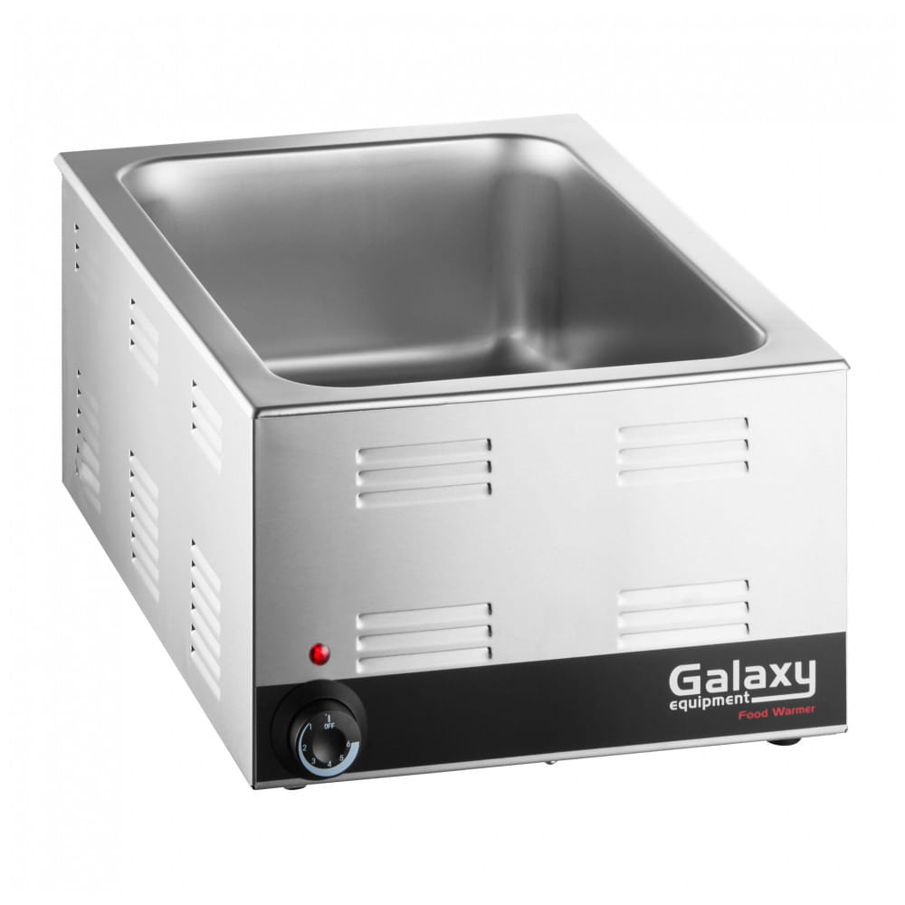 Atenção: Todos os produtos elétricos são 110V e necessitam de adaptador para a tomada no formato Brasileiro. O Galaxy GW50E é um aquecedor elétrico de alimentos para bancada com poço d'água em aço inoxidável, projetado para manter refeições preparadas em temperaturas seguras por horas em buffets, concessões e estações self-service. Possui capacidade para panela cheia de 12 x 20 polegadas(30,5X 50,8 cm) ou frações, com 27 qt (25,6 L) de volume interno e elementos de aquecimento internos específicos. O controle termostático ajustável vai até 78°C com tempo de aquecimento inferior a 30 minutos. A estrutura externa em aço inoxidável 20 gauge é resistente à corrosão e fácil de limpar. O cabo de alimentação mede 1,5 m e suporta instalação em bancada com 10 A de corrente. Indicado para catering, food trucks e cozinhas comerciais portáteis. Pesa 8,6 kg e possui dimensões compactas para mobilidade. Certificado NSF para uso alimentar. Ficha Técnica: Marca: Galaxy Fabricante: Galaxy Modelo: GW50E Cor: Prata (aço inoxidável) Materiais principais: Aço inoxidável (poço d'água e interior 20 gauge) Medidas: Largura 36,8 cm; profundidade 57,2 cm; altura 22,9 cm; interior 30,5 x 50,8 x 15,9 cm Peso do produto: 8,6 kg Peso do pacote: 10 kg Capacidade: 25,6 L (27 qt) Potência: 1.200 W Voltagem: 120 Volts Corrente: 10 A Faixa de temperatura: 36°C a 78°C Comprimento cabo: 1,5 m Tipo de plugue: NEMA 5-15P Fonte de alimentação: Elétrica, monofásica Faixa etária recomendada: Adultos (uso comercial) Conteúdo da caixa: 1 aquecedor elétrico de alimentos Manual do usuário: inglês Certificações: NSF