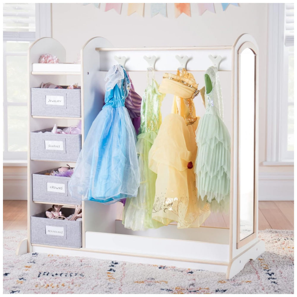 Atenção: Todos os produtos elétricos são 110V e necessitam de adaptador para a tomada no formato Brasileiro. O armário infantil Guidecraft EdQ Essentials Dress-up Storage em branco foi desenvolvido para organizar fantasias, roupas de brincar, sapatos e acessórios em quartos infantis, brinquedotecas e salas de aula. A estrutura em madeira multilaminada de bétula com pintura de fácil limpeza e cantos arredondados oferece segurança e resistência para uso frequente no ambiente infantil.? O móvel reúne um cabideiro longitudinal para pendurar roupas, prateleira superior aberta, espelho de corpo inteiro em Mylar e quatro caixas organizadoras em tecido para pequenos itens. Ganchos laterais com pontas seguras ampliam as opções de armazenamento para bolsas, capas e acessórios, mantendo tudo visível e acessível para a criança.? Com comprimento de 109 cm, largura de 56 cm e altura de 107 cm, o armário oferece capacidade de armazenamento compatível com uso em casa ou em ambientes educacionais. A estrutura suporta uso diário em contextos de educação infantil, com acabamento pensado para limpeza rápida com pano seco.? Ficha Técnica: Marca: Guidecraft? Fabricante: Guidecraft? Linha / Estilo: EdQ Essentials Dress-up Storage? Modelo: B0937GGLLZ? Tipo de produto: Armário infantil para fantasias e roupas de brincar? Cor: Branco? Formato: Retangular? Material da estrutura: Madeira multilaminada de bétula / madeira engenheirada com acabamento de fácil limpeza? Material das caixas/bins: Tecido? Quantidade de caixas/bins de tecido: 4 unidades? Recursos de armazenamento: Cabideiro longo, prateleira superior aberta, espaço inferior para bins de tecido? Espelho: Espelho de corpo inteiro em Mylar na lateral do armário? Ganchos laterais: Ganchos com pontas seguras para acessórios e fantasias? Comprimento (L): 109 cm? Largura (P): 56 cm? Altura (A): 107 cm? Idade recomendada: A partir de 3 anos? Local de uso indicado: Quartos infantis, brinquedotecas, salas de aula, espaços de homeschool? Acabamento: Superfície lisa de fácil limpeza, com cantos arredondados? Peso do pacote (produto + embalagem): 25,0kg? Cuidados de limpeza: Limpar com pano seco; evitar produtos abrasivos? Requer montagem: Sim, montagem por adulto? Ferragens e ferramentas: Ferragens e instruções incluídas? Conteúdo da caixa: Estrutura do armário em peças para montagem, 4 caixas/bins de tecido, ferragens e manual de instruções? Manual do usuário: Inglês