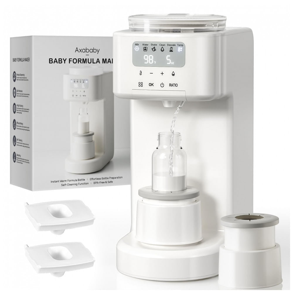 Atenção: Todos os produtos elétricos são 110V e necessitam de adaptador para a tomada no formato Brasileiro. Dispensador automático de fórmula infantil Axababy Advanced prepara mamadeiras em cerca de 2 minutos com sensores precisos para dosagem de 60 a 300 ml em incrementos finos e 4 temperaturas selecionáveis (37°C, 40°C, 43°C, 45°C), simulando proporções de água e pó de fórmula de 30 ml a 300 ml e 0,1 g a 99 g. Projetado para uso prático em alimentação noturna ou diária, possui tanque de água de 2 L e saída separada para fórmula seca, evitando umidade e aglomeração. Construído em polipropileno (PP) resistente, com partes destacáveis laváveis em lava-louças. Tecnologias incluem sensores de precisão para mistura suave que minimiza bolhas de ar, função de auto-limpeza e descalcificação para manutenção do sistema de água. Funcionalidades: dispensação de água morna instantânea, proporções ajustáveis 1:1 a 1:10, tanque de fórmula com design anti-umidade. Compatível com a maioria das mamadeiras e marcas de fórmula infantil padrão. Cuidados: utilize funções de limpeza após usos; lave partes destacáveis em lava-louças; substitua funil extra conforme necessidade. Ficha Técnica • Dimensões do produto: 47 cm (A) x 37,5 cm (L) x 22,9 cm (P); peso: 5,3 kg.? • Dimensões da embalagem: não especificadas; peso total estimado em embalagem: 6 kg.? • Potência: não especificada; fonte de alimentação: elétrica AC (corded, sem baterias).? • Capacidade: 60-300 ml (2-10 oz) em incrementos de 0,1 g; tanque de água: 2 L (67 oz); 4 temperaturas (37°C, 40°C, 43°C, 45°C).? • Materiais: polipropileno (PP); partes destacáveis laváveis em lava-louças.? • Faixa etária: bebês a partir do nascimento.? • Conteúdo da caixa: dispensador Axababy Advanced, funil extra, embalagem gift box.? • Manual do usuário: inglês.