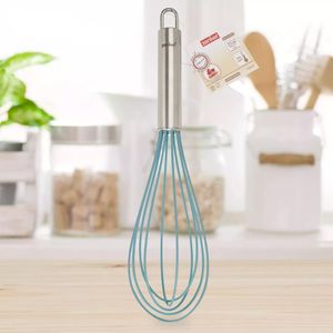 Um clássico absoluto em todas as cozinhas com uma aparência moderna. O batedor Candy em azul gelo da moda é o ajudante ideal para misturar molhos, cremes finos e massas e para bater ovos e natas com o seu batedor de silicone de malha fina e um comprimento total de aproximadamente 24 cm. A alça feita de aço inoxidável de alta qualidade é confortável de segurar e garante que os fios de agitação possam ser movidos uniformemente. Graças à parte funcional feita de silicone em azul gelo moderno em contraste com o nobre aço inoxidável, o prático ajudante também chama a atenção. Graças ao prático gancho para pendurar no cabo, o elegante batedor pode ser armazenado em uma prateleira da cozinha para economizar espaço. Após o uso, pode ser facilmente colocado na máquina de lavar louça para limpeza.
