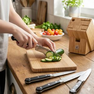 As facas são produzidas com aço inoxidável especial, garantindo resistência e cortes estáveis. O bloco em bambu mantém tudo organizado e fácil de acessar, valorizando a bancada e contribuindo para um ambiente funcional e bonito. Cada lâmina foi planejada para um tipo de preparo, permitindo que você realize desde cortes delicados até tarefas mais intensas com agilidade.