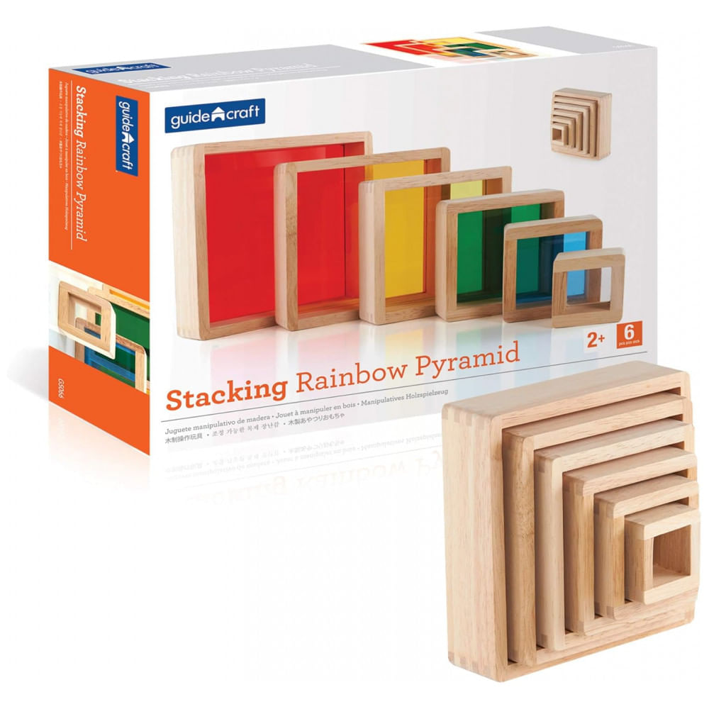 Atenção: Todos os produtos elétricos são 110V e necessitam de adaptador para a tomada no formato Brasileiro. O Guidecraft Stacking Rainbow Pyramid é um conjunto de 6 blocos quadrados em madeira com janelas de acrílico colorido, indicado para crianças de 2 a 7 anos explorarem empilhar, encaixar, ordenar e trabalhar cores. Os blocos podem ser usados empilhados em pirâmide, aninhados uns dentro dos outros ou combinados com mesas de luz para atividades de exploração de cor e transparência.? As peças possuem cantos e bordas arredondadas, com estrutura em madeira dura e janelas em acrílico colorido primário, adequadas ao manuseio por mãos pequenas. O maior quadrado mede 7 cm de altura e largura, e o conjunto favorece coordenação motora fina, noções de tamanho, sequenciamento e reconhecimento de cores em contextos de brincadeira livre e atividades dirigidas.? Ficha Técnica Marca: Guidecraft? Fabricante: Guidecraft? Nome do produto: Stacking Rainbow Pyramid? Modelo: G5066? Tipo de produto: Brinquedo de empilhar e ordenar com blocos em madeira e janelas acrílicas? Cor: Multicolorido, com janelas acrílicas transparentes em cores primárias? Material das molduras: Madeira dura (hardwood) com bordas arredondadas? Material das janelas: Acrílico/plexiglass colorido transparente? Quantidade de peças: 6 blocos quadrados empilháveis? Formato: Blocos quadrados ocos que podem empilhar ou aninhar em pirâmide? Dimensões do maior bloco (C x L x A): 18 cm x 18 cm x 5 cm? Dimensões aproximadas da embalagem (C x L x A): 18 cm x 18 cm x 5 cm? Faixa etária recomendada: De 2 a 7 anos? Objetivo educacional principal: Coordenação motora fina, classificação por tamanho, ordenação, exploração de cores e uso em atividades com mesa de luz? Ambiente de uso indicado: Uso interno em casa, escolas, salas de recursos e brinquedotecas? Peso do pacote (produto + embalagem): 1,25kg? Cuidados de limpeza: Limpar as partes em madeira e acrílico com pano macio levemente úmido; evitar produtos abrasivos? Requer montagem: Não; blocos fornecidos prontos para uso? Conteúdo da caixa: 6 blocos quadrados em madeira com janelas acrílicas coloridas em tamanhos graduados? Manual do usuário: Inglês