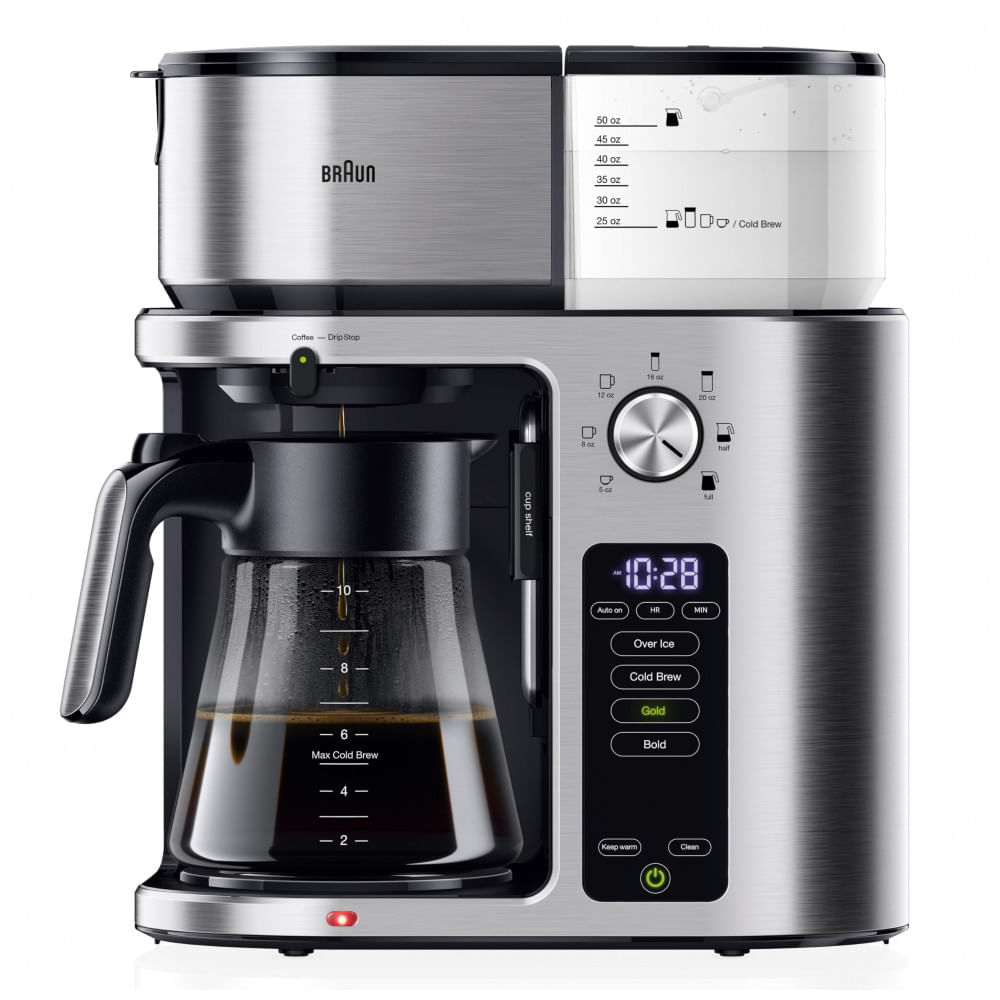 Atenção: Todos os produtos elétricos são 110V e necessitam de adaptador para a tomada no formato Brasileiro. A cafeteira Braun MultiServe Plus KF9270SI prepara café quente, cold brew ou over ice em 7 tamanhos de infusão (xícara única até carafa de 10 copos), com seletor rotativo e configurações Gold ou Bold via painel touch e dial. Sistema ExactBrew ajusta fluxo de água, temperatura e velocidade automaticamente para consistência em cada preparo, completando carafa completa em menos de 8 minutos ou cold brew em 13 minutos. Indicada para uso doméstico sem cápsulas, suporta copo de viagem ou garrafa térmica diretamente. Construída em alumínio, plástico e aço inoxidável com acabamento em aço, inclui filtro reutilizável. Tecnologias incluem timer programável, auto desligamento e certificação SCA Golden Cup para padrões de infusão. Funcionalidades abrangem funções pausa e serve, manutenção de calor e opções para bebidas geladas. Compatível com rede elétrica 120V 1600W, dimensões compactas de 18,0 x 33,0 x 38,1 cm para bancadas de cozinha. Cuidados recomendam uso de filtros #4, substituição periódica do filtro de carvão e descalcificação regular. Ficha Técnica Capacidade: 10 copos (carafa) Dimensões (P x L x A): 18,0 x 33,0 x 38,1 cm Peso do item: 6 kg Potência: 1600 W Materiais: Alumínio, plástico, aço inoxidável Fonte de alimentação: Elétrica 120V Faixa etária: Adultos Conteúdo da caixa: Cafeteira, carafa 10 copos, filtro #4, colher dosadora, filtro de carvão, cesta de filtro Manual do usuário: Inglês