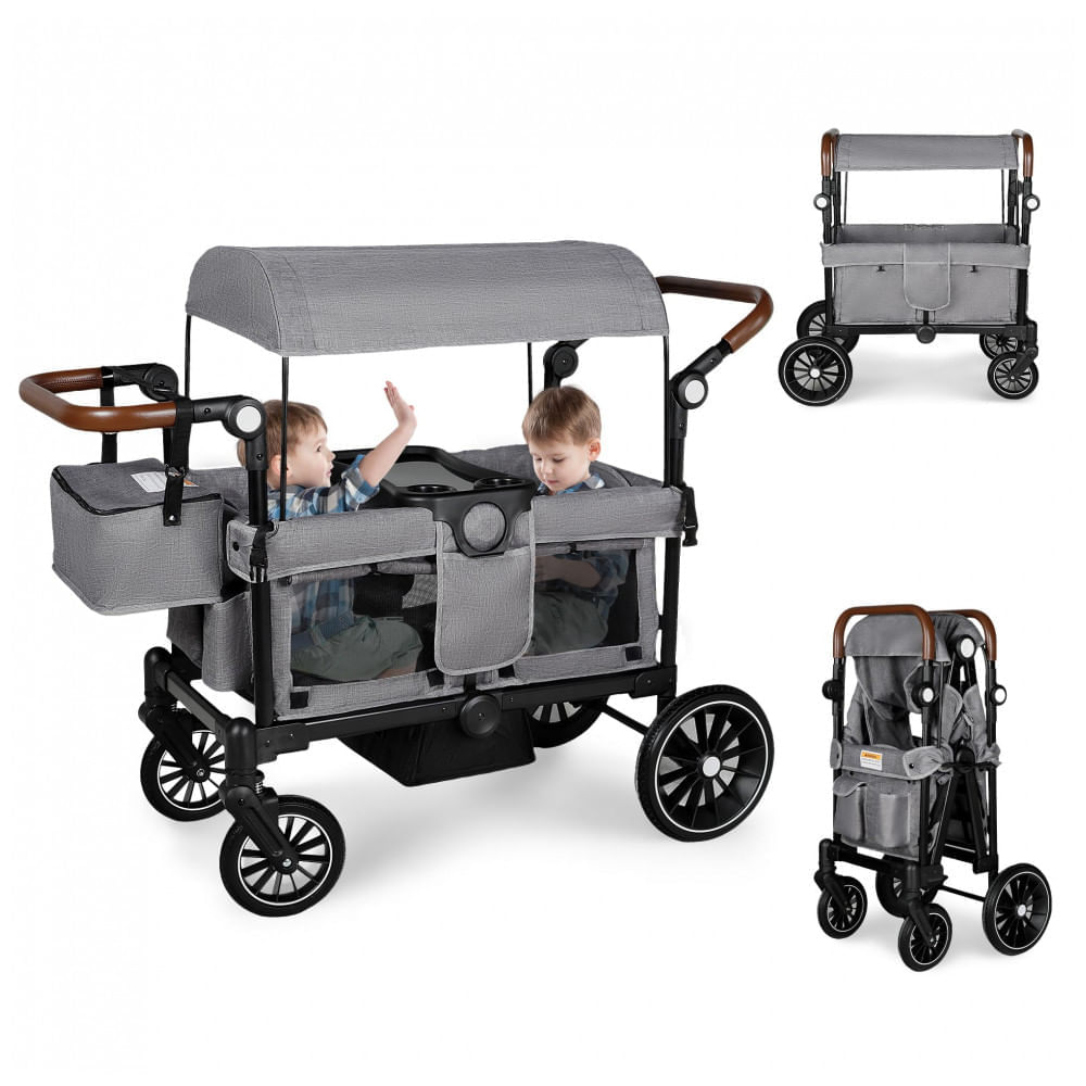 Atenção: Todos os produtos elétricos são 110V e necessitam de adaptador para a tomada no formato Brasileiro. Carrinho de passeio dupla Todecare cinza oferece estrutura para dois assentos infantis, com capacidade máxima de 50 kg e conversão em carrinho de compras ou transporte de pets ao remover as almofadas. Projetado para uso outdoor em compras, acampamentos ou passeios na praia, conta com rodas de PU de alto impacto, suspensão por molas e freio nos rodas traseiras para adaptação a diferentes terrenos. A cobertura removível ajustável em ângulos varia conforme a posição solar e permite lavagem em máquina. A alça de empurrar/puxar ajustável acomoda diferentes alturas de adultos, com bandeja destacável incluindo dois suportes para copos. Espaço interno ventilado por quatro janelas em tela, com área antiderrapante para pés e almofadas elevadas para estabilidade. Tecidos removíveis laváveis, incluindo capas e alças em couro sintético para manuseio. Estrutura em metal reforçado com cinto de segurança de três pontos e tecido envolvente para proteção contra impactos. Rodas dianteiras com giro de 360 graus facilitam manobras; dobra compacta para armazenamento em porta-malas de veículos padrão. Inclui organizador para pais com compartimentos laterais, bolsos e suportes adicionais. Compatível com crianças em idade de uso de carrinhos; montagem requerida com instruções mínimas. Ficha Técnica • Dimensões do produto: 98 x 47 x 102 cm (P x L x A)? • Peso do produto: 19,6 kg? • Capacidade máxima de peso: 50 kg? • Peso da embalagem: 20 kg • Potência: Não aplicável (manual)? • Capacidade: 2 crianças ou equivalente em carga até 50 kg? • Materiais: Estrutura e alça em metal; rodas em PU; tecidos removíveis laváveis? • Faixa etária: Bebês e crianças (unisex)? • Conteúdo da caixa: Carrinho completo, cobertura removível, bandeja destacável, organizador para pais, bolsa extra para fraldas, cintos de segurança? • Manual do usuário: Inglês (idioma principal)