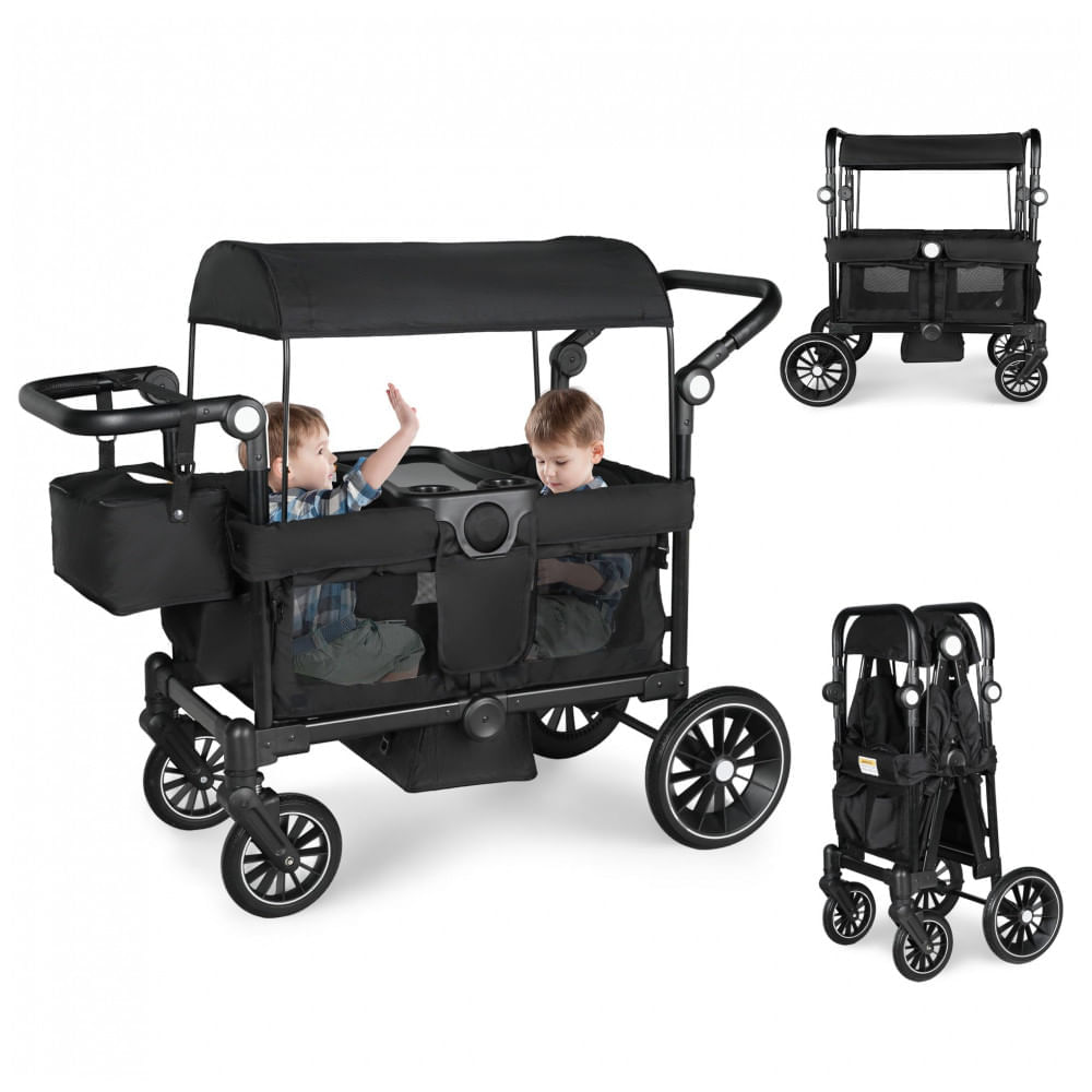 Atenção: Todos os produtos elétricos são 110V e necessitam de adaptador para a tomada no formato Brasileiro. Carrinho de passeio dupla Todecare preto oferece estrutura para dois assentos infantis, com capacidade de conversão em carrinho de compras ou transporte de pets ao remover as almofadas. Projetado para uso outdoor em compras, acampamentos ou passeios na praia, conta com rodas de PU de alto impacto, suspensão por molas e freio nos rodas traseiras para adaptação a diferentes terrenos. A cobertura removível ajustável em ângulos varia conforme a posição solar e permite lavagem em máquina. A alça de empurrar/puxar ajustável acomoda diferentes alturas de adultos, com bandeja destacável incluindo dois suportes para copos. Espaço interno ventilado por quatro janelas em tela, com área antiderrapante para pés e almofadas elevadas para estabilidade. Tecidos removíveis laváveis, incluindo capas e alças em couro sintético para manuseio. Estrutura em metal reforçado com cinto de segurança de três pontos e tecido envolvente para proteção contra impactos. Rodas dianteiras com giro de 360 graus facilitam manobras; dobra compacta para armazenamento em porta-malas de veículos padrão. Inclui organizador para pais com compartimentos laterais, bolsos e suportes adicionais. Compatível com crianças em idade de uso de carrinhos; exige montagem mínima sem ferramentas. Ficha Técnica • Dimensões do produto: 98 x 47 x 102 cm (P x L x A)? • Peso do produto: 19,6 kg? • Peso da embalagem: 20 kg • Capacidade: 2 crianças ou equivalente em carga? • Materiais: Estrutura e alça em metal; rodas em PU; tecidos removíveis laváveis? • Fonte de alimentação: Não aplicável? • Faixa etária: Bebês e crianças (unisex)? • Conteúdo da caixa: Carrinho completo, cobertura removível, bandeja destacável, organizador para pais, bolsa extra para fraldas, cintos de segurança? • Manual do usuário: Inglês (idioma principal)