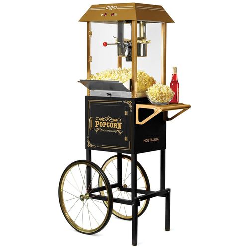 Atenção: Todos os produtos elétricos são 110V e necessitam de adaptador para a tomada no formato Brasileiro. Transforme sua casa em um verdadeiro cinema com o carrinho profissional de pipoca Nostalgia. Com um visual vintage que remete aos cinemas mudos e carnavais dos anos 1900, este carrinho possui uma grande panela de aço inoxidável de 295 ml de capacidade com sistema integrado de agitação de grãos, permitindo a produção de até 40 xícaras de pipoca de cinema por lote. Além disso, o carrinho conta com prateleira de utilidades, iluminção, bandeja coletora de grãos e compartimento de armazenamento para todos os seus acessórios. Suas rodas de borracha estilo bicicleta e alça facilitam a mobilidade, sendo possível removê lo da base para uso no balcão. E para completar, as janelas de vidro de segurança temperado resistem a quebras, arranhões e calor, garantindo a segurança de toda a família.