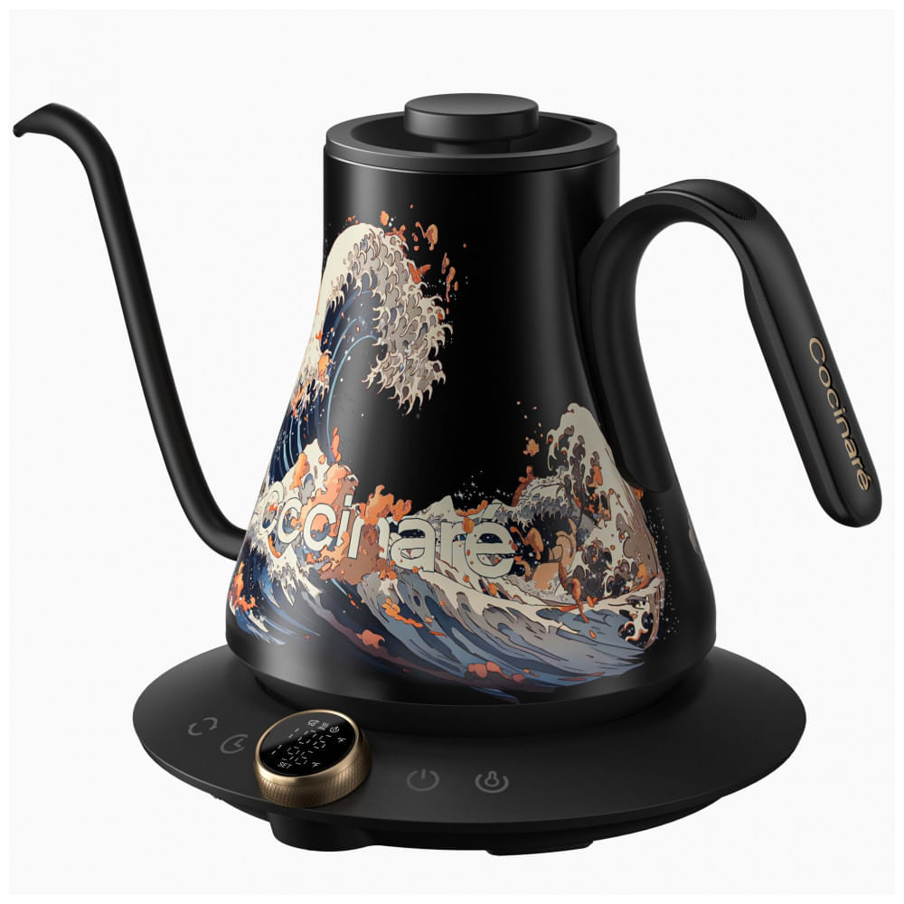 Atenção: Todos os produtos elétricos são 110V e necessitam de adaptador para a tomada no formato Brasileiro. A chaleira elétrica Cocinare FLOW M9 Wave possui capacidade de 0,9 litro e interior em aço inoxidável 304, indicada para preparo de café pour-over, chá e outras bebidas quentes com controle preciso de temperatura. A base eletrônica permite ajuste fino da temperatura e função de manter aquecido, oferecendo aquecimento rápido para uso em bancadas de cozinha e estações de café. O bico em pescoço de ganso com diâmetro reduzido foi desenvolvido para proporcionar fluxo estável e direcionado, facilitando o controle de vazão no preparo de café filtrado. O acabamento Wave apresenta estampa inspirada em ondas, e a chaleira conta com base inteligente com comandos dedicados, alimentação em 110V e potência de 1200W. Ficha Técnica: Marca: Cocinare Fabricante: Cocinare Modelo: FLOW M9 Electric Kettle Wave (CEK-201) Categoria: Chaleira elétrica pescoço de ganso Cor: Wave Capacidade: 0,9 L Potência: 1200W Voltagem: 110V Material interno em contato com a água: Aço inoxidável 304 Material externo do corpo: Aço inoxidável com acabamento polido Material da base: Plástico com acabamento resistente ao calor Tipo de bico: Pescoço de ganso fino (9 mm) Controle de temperatura: Controle eletrônico de temperatura com precisão fina Função manter aquecido: Até 2 horas Recursos de segurança: Proteção contra superaquecimento e fervura a seco Tipo de controle: Base inteligente com botões de comando Dimensões aproximadas (C x L x A): 27,4 cm x 18,8 cm x 20,6 cm Peso do produto: 1,8 kg Uso recomendado: Preparo de café pour-over, chá e outras bebidas quentes em ambiente doméstico ou estações de café Itens inclusos: 1 chaleira elétrica pescoço de ganso, 1 base inteligente Manual do usuário: Idioma inglês