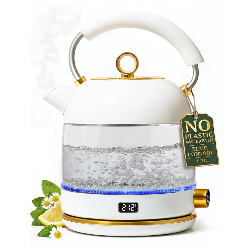 Atenção: Todos os produtos elétricos são 110V e necessitam de adaptador para a tomada no formato Brasileiro. A chaleira elétrica STYLED SETTINGS em vidro e aço inoxidável com capacidade de 1,7 litros foi desenvolvida para aquecimento rápido de água em uso doméstico, atendendo preparos de chá, café e outras bebidas quentes com controle de temperatura. A potência de 1500W proporciona aquecimento eficiente, reduzindo o tempo até a fervura, enquanto o corpo em vidro permite visualizar o volume de água e o processo de aquecimento. O controle de temperatura utiliza ajustes pré-definidos para diferentes faixas de aquecimento, facilitando a seleção da temperatura adequada para cada tipo de bebida. A função de manter aquecido conserva a água na faixa configurada por um período determinado, evitando a necessidade de novos ciclos de fervura ao longo do uso. Na passagem de água, o projeto utiliza vidro borossilicato, aço inoxidável e vedação em silicone de grau alimentício, sem janelas de nível ou insertos plásticos convencionais em contato direto com o líquido. A chaleira é apoiada em base giratória de 360°, permitindo posicionamento livre sobre a base e uso sem fio durante o serviço, com alça superior para manuseio estável. O equipamento incorpora desligamento automático ao final do ciclo e proteção contra funcionamento a seco, interrompendo o aquecimento em caso de ausência de água no reservatório. O produto é indicado para uso residencial sobre bancada, com alimentação em 110V, em cozinhas, copas e escritórios que demandam aquecimento frequente de água. Ficha Técnica: Marca: STYLED SETTINGS Fabricante: Styled Settings Modelo: Y6258GE Tipo de produto: Chaleira elétrica Aplicação: Aquecimento de água para chá, café e outras bebidas quentes Instalação: Sobre bancada, com base elétrica destacável Capacidade: 1,7 L Potência: 1500 W Potência em HP: 2,01 HP Potência em CV: 2,0 CV Tensão de alimentação: 110V Frequência: 60 Hz Material do corpo: Vidro borossilicato e aço inoxidável Materiais em contato com a água: Vidro borossilicato, aço inoxidável, silicone grau alimentício Cor: Branco com detalhes dourados Acabamento: Polido Dimensões do produto (C x L x A): 17,8 cm x 12,7 cm x 25,9 cm Peso do produto: 0,6 kg Peso do pacote (produto + embalagem): 0,9 kg Recursos de aquecimento: Aquecimento de água por resistência elétrica de 1500W Controle de temperatura: Controle digital com seleção de temperaturas pré-definidas Função manter aquecido: Função de manutenção de temperatura após o aquecimento Recursos de segurança: Desligamento automático, proteção contra fervura a seco, proteção contra superaquecimento Indicadores: Indicador de nível de água no corpo em vidro e display digital de temperatura Base: Base giratória 360° com conexão elétrica Cabo de alimentação: Cabo elétrico acoplado à base Uso recomendado: Uso residencial em cozinhas, copas e escritórios Conteúdo da embalagem: Chaleira elétrica em vidro e aço inoxidável, base elétrica, manual do usuário Manual do usuário: Manual em inglês
