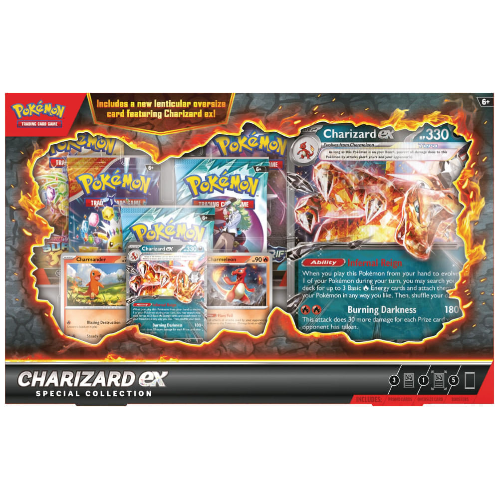Atenção: Todos os produtos elétricos são 110V e necessitam de adaptador para a tomada no formato Brasileiro. A coleção especial Pokémon TCG Charizard ex Special Collection é um conjunto temático desenvolvido para jogadores e colecionadores que desejam adicionar cartas promocionais de Charizard ex e de sua linha evolutiva à coleção. O produto inclui uma carta promocional etched foil de Charizard ex em tamanho padrão de jogo, adequada para uso em baralhos conforme as regras oficiais do Pokémon TCG. A coleção acompanha duas cartas foil adicionais com Charmander e Charmeleon, permitindo montar a linha evolutiva completa do Pokémon em versão promocional. O conjunto inclui ainda cinco boosters do Pokémon TCG com cartas em inglês e uma carta oversize lenticular de Charizard ex, projetada para exposição com efeito visual ao movimentar o card. O item traz também um código para Pokémon TCG Live, possibilitando resgate de conteúdo digital relacionado ao jogo de cartas online. A embalagem em papel com estampa multicolorida é organizada para acomodar as cartas promocionais, o card gigante e os boosters, sendo indicada para crianças e entusiastas de jogos a partir de 6 anos. Ficha Técnica: Marca: Pokémon Fabricante: The Pokémon Company International Linha: Pokémon TCG Produto: Charizard ex Special Collection Modelo: 100-10417 : C : EN : 45 : Cor: Estampa multicolorida temática Charizard ex Ano de lançamento: 2025 Idioma das cartas: Inglês Faixa etária recomendada: A partir de 6 anos Usuários indicados: Crianças e entusiastas de jogos Material principal: Papel Dimensões do produto (C x L x A): 30,5 cm x 22,9 cm x 0,3 cm Peso do produto: 0,36 kg Quantidade de boosters: 5 boosters Pokémon TCG Carta promocional padrão: 1 carta etched foil Charizard ex em tamanho oficial de jogo Cartas promocionais adicionais: 2 cartas foil com Charmander e Charmeleon Carta promocional oversize: 1 carta lenticular oversize Charizard ex Código digital: 1 código para Pokémon TCG Live Manual do usuário: Inglês (informações nas embalagens e materiais internos)