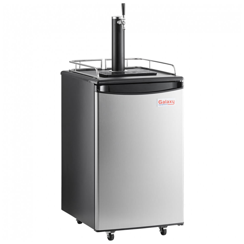 Atenção: Todos os produtos elétricos são 110V e necessitam de adaptador para a tomada no formato Brasileiro. O Galaxy Single Tap Kegerator é um dispensador de chope projetado para uso em eventos leves, como pequenas festas corporativas ou reuniões de grupo, com capacidade para 1 barril de 1/2 (estilo 1/2 barrel). Ele utiliza isolamento em espuma injetada no local e sistema de refrigeração eficiente com refrigerante R-600a para manter a temperatura ideal de serviço entre 2°C e 10°C. O interior forrado em plástico e porta de aço com revestimento de vinil facilitam a limpeza. Inclui tanque de CO2 vazio de 1,13 kg, regulador duplo de CO2 e acoplador tipo "D" para conexão rápida de barris. A torre de torneira de 30 cm de altura e 7,6 cm de diâmetro permite dispensar chope gelado, com bandeja de gotejamento removível. Rodízios de 7,6 cm (dois com freio) auxiliam no transporte. Compatível com conexão elétrica 115V, possui compressor traseiro, 2 prateleiras internas e acabamento externo preto em aço. Indicado para chopeiras portáteis em aplicações comerciais leves, com guarda-corpo cromado superior. Ficha Técnica: Marca: Galaxy Modelo: Single Tap Kegerator Cor: Preto Materiais principais: Aço com pintura preta, porta com revestimento de vinil, interior plástico Medidas: 54,3 cm (largura) x 68,3 cm (profundidade) x 114,3 cm (altura) Medidas internas: 44 cm (largura) x 41,9 cm (profundidade) x 69,5 cm (altura) Profundidade total: 76,7 cm Peso da embalagem: 42,8 kg Capacidade: 1 barril de 1/2 (estilo 1/2 barrel), 0,17 m³ Torre de torneira: 29,8 cm altura x 7,6 cm diâmetro Potência inicial: 87 W Corrente: 1,2 A Voltagem: 115 Volts Frequência: 60 Hz Fase: 1 Refrigerante: R-600a (capacidade 28 g) Faixa de temperatura: 2°C a 10°C BTU total: 222 Rodízios: 7,6 cm, 4 unidades (2 com freio) Tipo de plugue: NEMA 5-15P Fonte de alimentação: Elétrica Portas: 1 porta sólida Torneiras: 1 Prateleiras: 2 Compressor: Montado na traseira Conteúdo da caixa: 1 chopeira, tanque CO2 vazio 1,13 kg, regulador duplo CO2, acoplador tipo D Manual do usuário: inglês