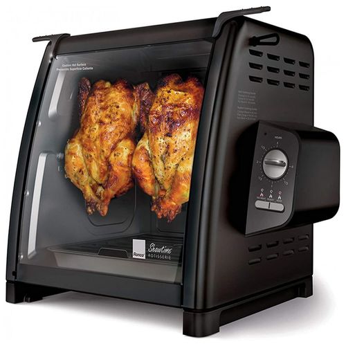 Atenção: Todos os produtos elétricos são 110V e necessitam de adaptador para a tomada no formato Brasileiro. FORNO DE GRANDE CAPACIDADE O interior é grande o suficiente para cozinhar até um peru de 6,5 kg ou 2 frangos inteiros de cada vez, mas com apenas de altura e de largura, o Showtime Modern Rotisserie é compacto para caber em armários para facilitar o zenamento quando não estiver em uso.