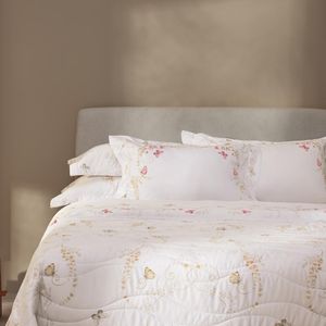 A Colcha Primaverili Queen é uma homenagem à beleza da primavera, onde as flores e borboletas dançam sobre o cetim 300 fios, criando uma obra de arte em constante evolução.