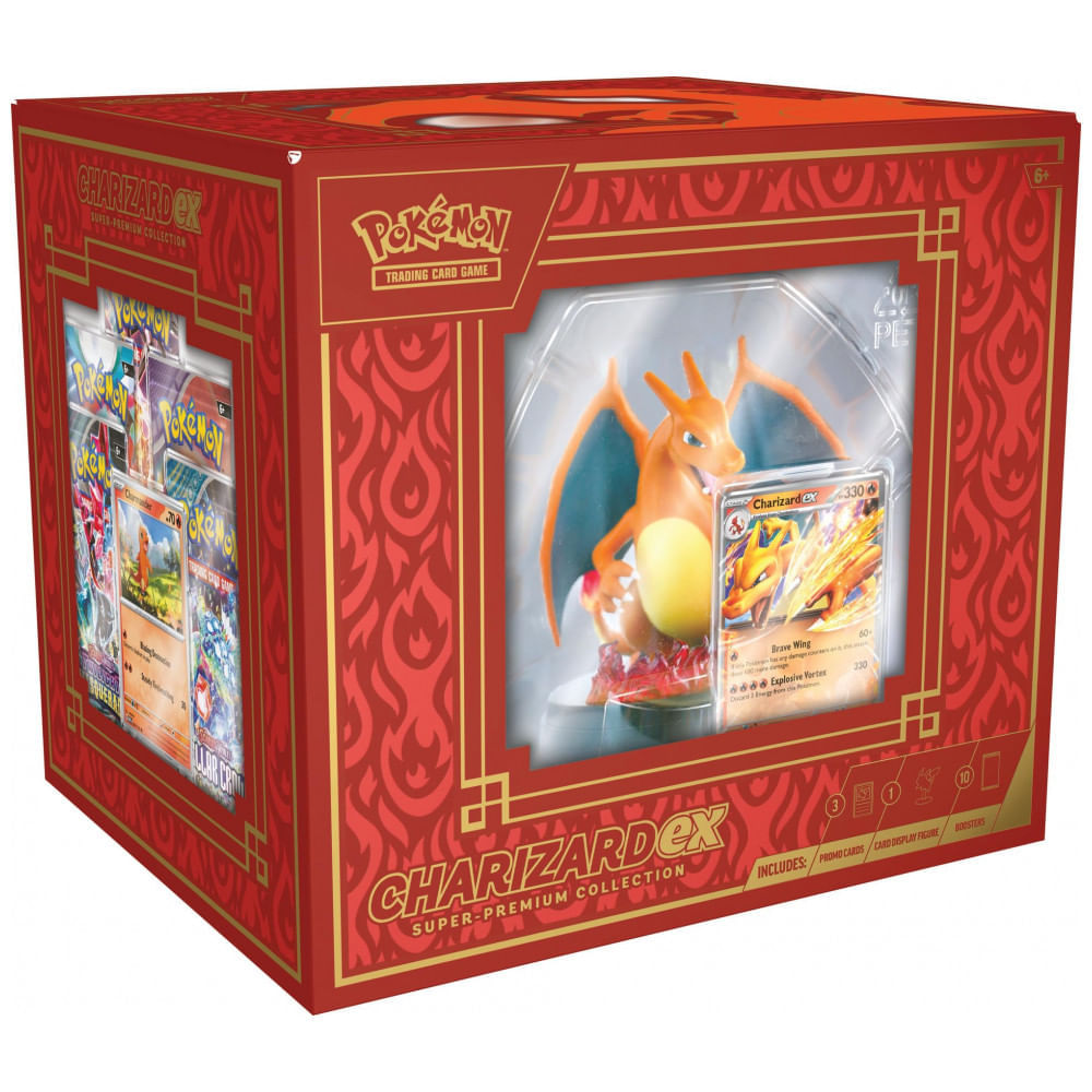 Atenção: Todos os produtos elétricos são 110V e necessitam de adaptador para a tomada no formato Brasileiro. A coleção Pokémon TCG Charizard ex Super Premium é um conjunto temático voltado a jogadores e colecionadores que desejam reunir cartas exclusivas do universo de Charizard em um único produto. O kit combina cartas promocionais holográficas, miniatura expositora e diversos boosters, permitindo tanto a expansão de decks quanto a montagem de exibição estática com foco no personagem. O conjunto inclui cartas holográficas de Charmander, Charmeleon e Charizard ex em padrão de acabamento especial, destinadas a uso em jogo ou coleção. A miniatura plástica de Charizard foi projetada com base para acomodar uma carta em posição vertical, permitindo exibir uma carta destacada em prateleiras, mesas ou vitrines. A seleção de boosters contempla 10 pacotes de expansão do Pokémon TCG, oferecendo variedade de cartas para reforço de baralhos e incremento da coleção. A embalagem tem formato de caixa rígida em material cartão reforçado, com acabamento gráfico multicolorido e dimensões adequadas para armazenamento dos itens sem deformação. O interior é compartimentado para manter a miniatura, as cartas promocionais e os boosters organizados durante o transporte e o período de guarda. O produto acompanha um código para resgate de conteúdo digital no Pokémon TCG Live, direcionado a jogadores que utilizam a versão online do jogo. Recomendado a partir de 6 anos, o kit utiliza papel cartão e plástico como materiais principais, mantendo proporções adequadas ao manuseio e ao armazenamento em coleções de cartas. O conjunto é indicado para uso doméstico, em ambientes internos, e deve ser mantido em local seco e protegido da luz solar direta para preservar a integridade das cartas e da miniatura. Ficha Técnica: Marca: Pokémon Fabricante: Pokémon Company / Pokémon Linha: Pokémon TCG – Coleção Charizard ex Super Premium Tipo de produto: Coleção de cartas colecionáveis com miniatura expositora Conteúdo principal: Cartas Pokémon TCG, miniatura de Charizard e código digital Cartas promocionais inclusas: 1 carta promocional foil de Charizard ex, 1 carta foil de Charmander, 1 carta foil de Charmeleon Quantidade de boosters: 10 pacotes de booster Pokémon TCG Idioma das cartas: Inglês Dimensões do produto (C x L): 23 cm x 25 cm Altura aproximada da embalagem: 10 cm Peso do produto: 1,14 kg Peso do pacote (produto + embalagem): 1,14 kg Material predominante das cartas: Papel cartão revestido Material da miniatura: Plástico Cor da embalagem: Multicolorida com tema Charizard Faixa etária recomendada: A partir de 6 anos Departamento: Unissex Uso indicado: Jogo de cartas colecionáveis e coleção temática Recurso digital: 1 código para Pokémon TCG Live Conteúdo da embalagem: 10 boosters Pokémon TCG, 1 carta promocional foil Charizard ex, 2 cartas foil (Charmander e Charmeleon), 1 miniatura expositora de Charizard, 1 código para Pokémon TCG Live Manual do usuário: Idioma inglês (instruções gerais de uso e regras do jogo no material oficial do Pokémon TCG)