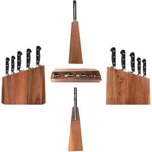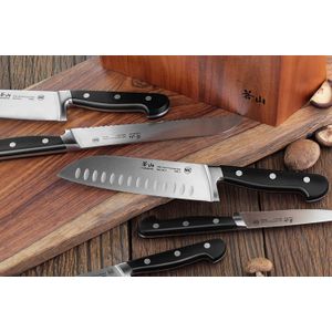 Produto importado dos Estados Unidos o prazo de entrega e de ate 25 dias uteis As importacoes sao oficiais atraves do Regime de Tributacao Simplificada da Receita Federal O preco inclui imposto de Importacao ICMS Frete Nacional Frete Internacional Servicos Alfandegarios e a intermediacao de cambio para pagamento no exterior O preco ja inclui todos os custos nao sera cobrado nenhum valor extra para o recebimento do produto ATENCAO Todos os produtos eletricos sao 110V e necessitam de adaptador para a tomada no formato brasileiro Cangshan e uma marca de calibre profissional de facas de cozinha dedicada a combinar os melhores pontos fortes qualidades e beleza das facas de estilo ocidental e oriental Nossa paixao e projetar e fabricar facas distintas praticas e impressionantes que durarao nos proximos anos Criamos facas unicas que os chefs profissionais podem ficar empolgados e orgulhosos de usaro bloco de madeira de acacia solido projetado com tecnologia de ponta e com patente pendente funciona com as facas com bom gosto cada bloco e feito a mao e tem seu proprio graoX50Cr15MoV German Steel com HRC 58 2 na escala de dureza Rockwello conjunto de facas de 6 pecas inclui o chef de 8 polegadas o Santoku de 7 polegadas o pao de 8 polegadas e o utilitario serrilhado de 5 polegadas Bloco de facas de acacia solido de 5 slots 10 116 L x 3 616 de W x 11 916 de H polegadasAprovado pela National Sanitation Foundation NSF Serie V2 A serie V2 define o padrao feito bonito Esta serie foi projetada propositadamente para mostrar a beleza simples das facas de cozinha classicas concentrandose em elevar sua funcionalidade pratica Usamos uma borda oca de estilo asiatico para fornecer um corte suave e sem esforco Nossas facas sao bem equilibradas e perfeitamente trabalhadas permitindo o uso pesado da cozinha e a limpeza facil Materiais de primeira qualidade Esta faca possui aco alemao X50Cr15MoV de alta liga para um produto duradouro e duradouro Este aco de alta liga e geralmente mais macio o que permite que seja facilmente afiado novamente apos uso pesado Fabricacao superior Cada lamina passa por um processo de tratamento termico de precisao de 6 estagios que leva a granulacao fina do material a uma estrutura interna mais estavel Um processo tradicional de afiacao manual em tres etapas garante uma borda nitida enquanto o processo de endurecimento por gelo garante que a lamina mantenha sua nitidez Principais Caracteristicas Forjadas a partir de aco inoxidavel X50Cr15MoV de alta liga submetidas a varias etapas ULTRA6 Processo de tratamento termico Lamina endurecida em gelo fornece nitidez duradoura Lustrada e afiada a mao por um especialista em laminas Alca classica com reforco redesenhado com patente