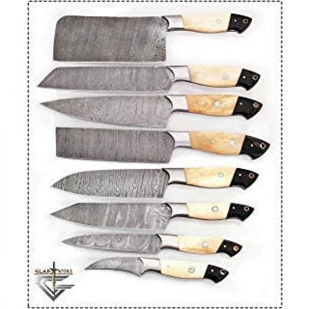 Produto importado dos Estados Unidos o prazo de entrega e de ate 25 dias uteis As importacoes sao oficiais atraves do Regime de Tributacao Simplificada da Receita Federal O preco inclui imposto de Importacao ICMS Frete Nacional Frete Internacional Servicos Alfandegarios e a intermediacao de cambio para pagamento no exterior O preco ja inclui todos os custos nao sera cobrado nenhum valor extra para o recebimento do produto ATENCAO Todos os produtos eletricos sao 110V e necessitam de adaptador para a tomada no formato brasileiro 8 Pcs Damasco Steel Kitchen Chef Utility Knife Set with Chopper or CleaverOferecido por GladiatorsGuild para cozinha Camping e Caca composta por cabo de madeira ou ossoPersonalizado ou feito a mao damasco aco faca de cozinha com um pedaco de chifre preto no final do punhoComprimentos da laminaPara proteger o conjunto de facas de cozinha DAMASCUS certifiquese de limpar com um pano e aplicar oleo vegetal apos cada uso NAO DEIXE MOLHAR POR MUITO TEMPO ARMAZENAR OLEO O tempo todo Quantidade por pacote de itens 8 Cor Osso branco DAMASCUS STEEL E ALTAMENTE VULNERAVEL PARA A FERRAMENTA PARA PROTEGER O JOGO DE FACAS DE COZINHA DAMASCUS TENHA LIMPEZA COM UM PANO E APLIQUE O OLEO VEGETAL APOS CADA USO NAO DEIXE MOLHAR POR MUITO TEMPO ARMAZENAR OLEO O tempo todo