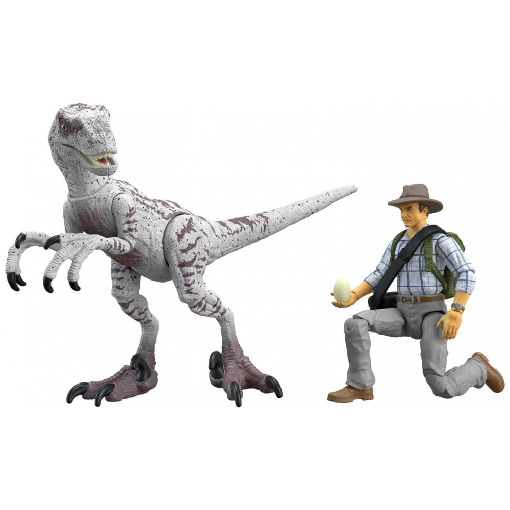 Atenção: Todos os produtos elétricos são 110V e necessitam de adaptador para a tomada no formato Brasileiro. O set Hammond Collection Jurassic Park III com Dr. Alan Grant e Velociraptor recria a cena da devolução dos ovos em Isla Sorna, trazendo figura humana, dinossauro e acessórios para exposição e brincadeira colecionável. A coleção Hammond é voltada a colecionadores, com pintura detalhada, escultura fiel ao filme e articulações avançadas em escala aproximada de 3,75".? A figura do Dr. Alan Grant vem com camisa xadrez, chapéu safari, mochila verde, bolsa de transporte e dois ovos de raptor removíveis, além de par de mãos extras para segurar acessórios. O Velociraptor fêmea apresenta articulações múltiplas e pintura inspirada no visual do filme Jurassic Park III.? Ficha Técnica Marca: Mattel? Linha: Jurassic World Hammond Collection? Nome do produto: Jurassic Park III Dr. Alan Grant & Velociraptor Pack? Código / Modelo: HLN14? Tipo de produto: Conjunto de figuras de ação colecionáveis com acessórios? Escala aproximada: 3,75"? Conteúdo do conjunto: 1 figura Dr. Alan Grant, 1 figura de Velociraptor fêmea, 1 mochila, 1 bolsa de transporte, 2 ovos de dinossauro, mãos extras para Grant? Articulação Dr. Alan Grant: 16 pontos de articulação, incluindo joelhos com dupla articulação e mãos intercambiáveis? Articulação Velociraptor: Múltiplos pontos de articulação com cauda longa e poseável? Tema: Cena de “retorno dos ovos” em Isla Sorna, Jurassic Park III? Cor predominante: Multicolorido? Material: Plástico? Faixa etária recomendada: A partir de 8 anos (96 a 1188 meses)? Dimensões aproximadas da embalagem (C x L x A): 135 cm x 50 cm x 39 cm (53,11" x 19,60" x 15,31")? Peso do produto: 0,24kg? Peso do pacote (produto + embalagem): 0,24kg? Objetivo de uso: Brincadeira temática, exposição colecionável e recriação de cenas dos filmes? Fonte de energia: Não requer baterias? Cuidados de limpeza: Limpar as figuras com pano macio seco; evitar água em excesso e produtos abrasivos? Requer montagem: Não; figuras e acessórios prontos para uso? Conteúdo da caixa: 1 figura Dr. Alan Grant, 1 figura Velociraptor, 1 mochila, 1 bolsa, 2 ovos e mãos extras? Manual do usuário: Inglês (orientações básicas impressas na embalagem)?