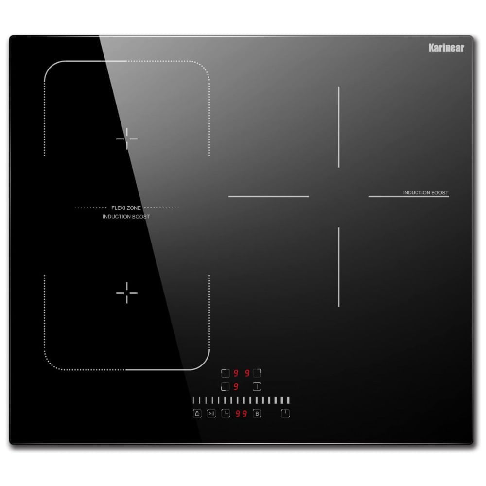Atenção: Todos os produtos elétricos são 110V e necessitam de adaptador para a tomada no formato Brasileiro. O cooktop de indução de embutir 59 cm Karinear com 3 zonas de aquecimento foi projetado para uso residencial em cozinhas compactas, oferecendo operação totalmente elétrica em 220V com instalação fixa (sem plugue). A superfície em vidro preto liso confere visual moderno e facilita a limpeza, bastando passar um pano úmido após o uso. A zona dupla à esquerda pode funcionar como duas bocas independentes ou como uma zona flex contínua para panelas grandes ou retangulares, ampliando a área de aquecimento para churrasqueiras de mesa, chapas e panelas alongadas. O controle deslizante (slider) permite ajustar rapidamente a potência e o tempo de cozimento, bastando deslizar o dedo na barra de comando, sem necessidade de pressionar teclas repetidamente. O equipamento oferece até 9 níveis de potência com função Boost, atingindo potências elevadas para ferver água e selar alimentos com rapidez. A zona direita funciona como queimador independente de alta potência, adequada para panelas médias e grandes. O painel incorpora temporizador de até 99 minutos, função pausa, desligamento automático, indicação de alta temperatura e proteção contra superaquecimento, aumentando a segurança no uso diário. A trava de segurança infantil bloqueia os comandos para evitar acionamento acidental. Como todo cooktop de indução, exige panelas ferromagnéticas (que sejam atraídas por ímã) para funcionamento adequado. O modelo é indicado para instalação embutida em bancada, seguindo as medidas de recorte especificadas pelo fabricante. Ficha Técnica: Marca: Karinear Fabricante: Karinear Modelo: KNI-602S1 Tipo de produto: Cooktop de indução de embutir Uso recomendado: Residencial, cozinhas internas Cor: Preto Material da superfície: Vidro cerâmico/vidro temperado preto Tipo de aquecimento: Indução elétrica Número de zonas de aquecimento: 3 zonas (sendo 2 unificáveis em zona flex) Zona esquerda traseira: 1800W (Boost 2100W) Zona esquerda frontal: 1800W (Boost 2100W) Zona flex (esquerda combinada): 3000W (Boost 3400W) Zona direita: 2300W (Boost 3000W) Potência total instalada: 6800W Níveis de potência: 9 níveis de potência por zona Tipo de controle: Painel touch com controle deslizante (slider) Funções adicionais: Timer até 99 minutos, função pausa, Boost, desligamento automático, aviso de alta temperatura, proteção contra superaquecimento Trava de segurança: Trava de segurança infantil Tipo de instalação: Embutir (hard wire, sem plugue) Tensão de alimentação: 220V Frequência: 50/60 Hz Dimensões do produto (L x P x A): 59,0 cm x 52,0 cm x 6,1 cm Dimensões de recorte (L x P): 56,0 cm x 49,0 cm Peso do produto: 8,5 kg Peso do pacote (produto + embalagem): 9,5 kg Compatibilidade de panelas: Panelas com fundo ferromagnético (atraídas por ímã) Conteúdo da embalagem: Cooktop de indução Karinear 3 zonas, raspador de limpeza, kit básico de fixação, manual do usuário Manual do usuário: Inglês