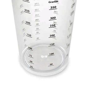 O copo contém medidas para arroz, farinha, açúcar, feijão e outros alimentos. Perfeito para preparo de bolos e pães.