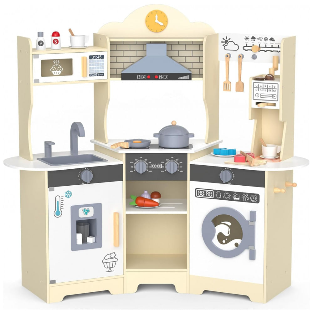 Atenção: Todos os produtos elétricos são 110V e necessitam de adaptador para a tomada no formato Brasileiro. Cozinha infantil de madeira ANPABO na cor amarela, desenvolvida para crianças pequenas com foco em brincadeiras de faz de conta, reunindo coifa, fogão, micro-ondas, pia e máquina de lavar em uma única estrutura. A construção utiliza materiais livres de BPA, tinta atóxica e cantos arredondados, alinhando segurança e durabilidade para uso frequente em ambientes internos.? O conjunto permite que até três crianças brinquem simultaneamente, contando com coifa com luzes e sons, fogão com botões giratórios com cliques, cafeteira, módulo de gelo, micro-ondas e pia funcional de brinquedo. Acompanham 30 acessórios, incluindo panelas, utensílios, xícaras e alimentos de brinquedo com peças “cortáveis”, que estimulam coordenação motora, imaginação e desenvolvimento de linguagem durante o faz de conta.? O formato foi pensado para se integrar a quartos infantis e salas de brinquedo, aproveitando bem o espaço disponível e facilitando a organização após a brincadeira por meio de nichos e armários. A recomendação de idade do fabricante é a partir de 3 anos, considerando o tamanho da estrutura e a presença de peças pequenas.? Ficha Técnica: Marca: ANPABO? Fabricante: ANPABO? Modelo: Cozinha infantil de madeira amarela com luzes, sons e 30 acessórios? Tipo de produto: Cozinha infantil de brinquedo em madeira com iluminação e sons? Material principal: Madeira e componentes livres de BPA, com tinta atóxica? Cor: Amarelo com detalhes coloridos em madeira? Idade recomendada: A partir de 3 anos? Altura (A): 96 cm (aprox.)? Largura (L): 25 cm (aprox.)? Profundidade (P): 68 cm (aprox.)? Peso do produto: 18,1kg (aprox.)? Número de peças inclusas: 30 acessórios entre panelas, utensílios, xícaras e alimentos de brinquedo? Recursos de interação: Coifa com luzes e sons, fogão com botões clicáveis, cafeteira, dispenser de gelo, micro-ondas, máquina de lavar, pia e armários? Recursos de segurança: Certificação de segurança para brinquedos, cantos arredondados, materiais atóxicos? Conteúdo da embalagem: Estrutura de cozinha de madeira para montar, conjunto de 30 acessórios de cozinha de brinquedo? Fonte de alimentação: Requer pilhas para os efeitos de luz e som (conforme especificação do fabricante)? Local de uso indicado: Áreas internas como quartos infantis, salas de brinquedo ou espaços educativos? Manual do usuário: Inglês?