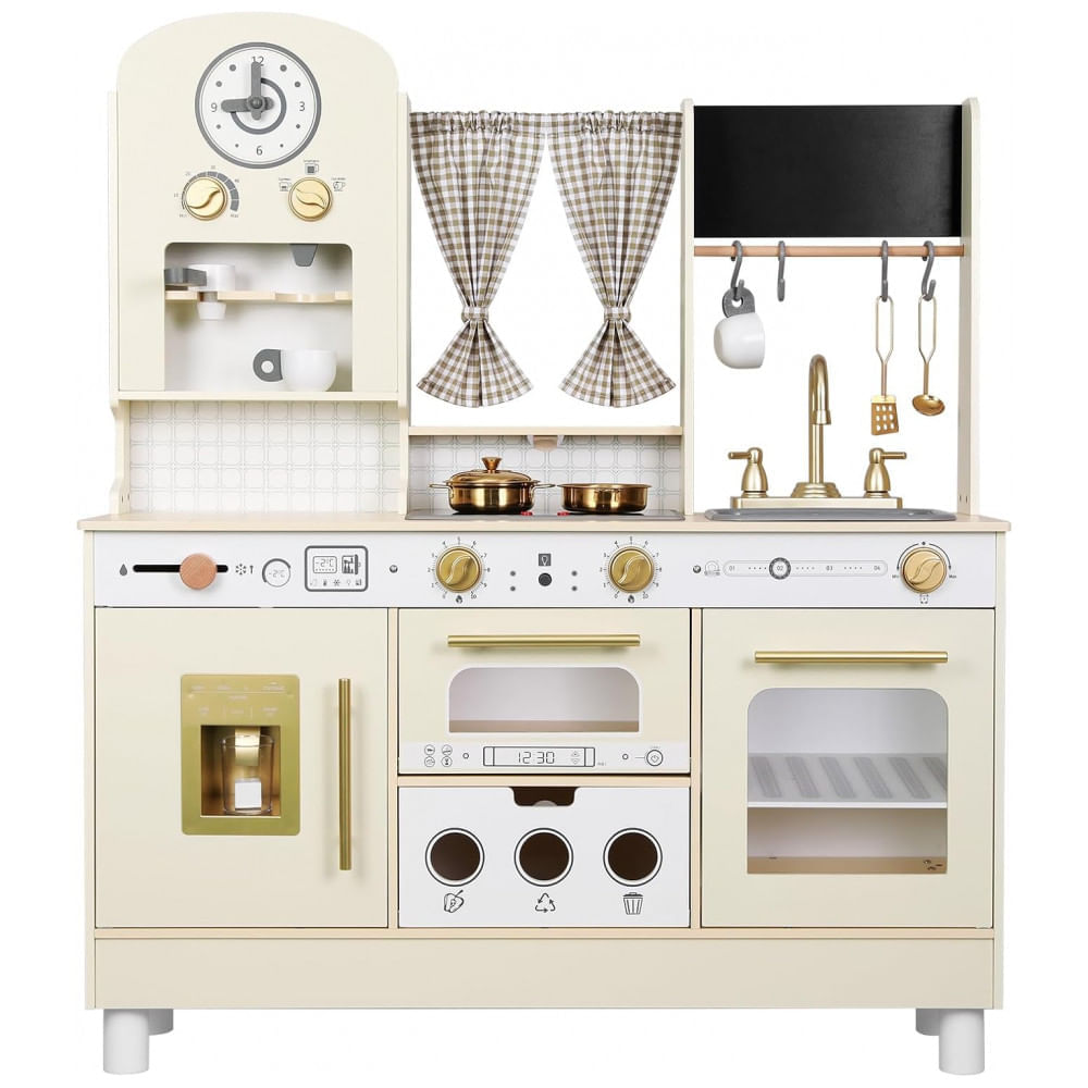 Atenção: Todos os produtos elétricos são 110V e necessitam de adaptador para a tomada no formato Brasileiro. Cozinha infantil de madeira EDUBEBO desenvolvida para crianças a partir de 3 anos, com estrutura de altura ajustável em três posições para acompanhar o crescimento e manter a bancada em nível adequado ao uso. O conjunto integra fogão com som, pia, forno, armários e prateleiras, permitindo simulação de preparo de alimentos, organização e serviço em contexto de cozinha doméstica.? A fabricação utiliza madeira e componentes plásticos atóxicos, com superfícies lisas, cantos arredondados e sistema anti-tombamento, em conformidade com normas de segurança para brinquedos infantis como ASTM F963 e CPSIA. A área frontal foi dimensionada para que mais de uma criança possa brincar ao mesmo tempo, favorecendo interação social, comunicação e divisão de tarefas durante o faz de conta.? O acabamento branco com detalhes em madeira facilita a integração em quartos infantis, salas de brinquedo e áreas de convivência, com visual neutro e contemporâneo. A recomendação de idade do fabricante é a partir de 3 anos, em função da altura da estrutura e da presença de pequenos acessórios.? Ficha Técnica: Marca: EDUBEBO? Fabricante: EDUBEBO? Modelo: EAMZ001? Tipo de produto: Cozinha infantil de brinquedo em madeira com altura ajustável? Material principal: Madeira e componentes plásticos atóxicos? Cor: Branco com detalhes em madeira? Idade recomendada: A partir de 3 anos? Altura mínima (A): 100 cm? Altura máxima (A): 115 cm? Largura (L): 91 cm? Profundidade (P): 29 cm? Peso do produto: 18,9kg? Recursos de interação: Fogão com som, botões giratórios, portas que abrem, timer ajustável e módulos de armazenamento? Ajuste de altura: Três posições de altura da estrutura? Acessórios inclusos: Utensílios e acessórios de cozinha de brinquedo variados? Recursos de segurança: Sistema anti-tombamento, cantos arredondados, materiais atóxicos, montagem por adulto? Fonte de alimentação dos módulos eletrônicos: Bateria incluída para efeitos sonoros? Aplicação: Uso em ambientes internos, como quartos infantis, salas de brinquedo ou áreas comuns? Manual do usuário: Inglês?
