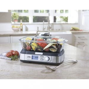 Produto importado dos Estados Unidos o prazo de entrega e de ate 25 dias uteis As importacoes sao oficiais atraves do Regime de Tributacao Simplificada da Receita Federal O preco inclui imposto de Importacao ICMS Frete Nacional Frete Internacional Servicos Alfandegarios e a intermediacao de cambio para pagamento no exterior O preco ja inclui todos os custos nao sera cobrado nenhum valor extra para o recebimento do produto ATENCAO Todos os produtos eletricos sao 110V e necessitam de adaptador para a tomada no formato brasileiro Os consumidores que procuram uma maneira saudavel de cozinhar vao adorar o novo Cook Fresh Digital Glass Steamer da Cuisinart Um poderoso sistema de vapor fornece vapor de cima para baixo envolvendo os alimentos para cozinhar de forma rapida e uniforme A panela de vidro de 5 litros e grande o suficiente para porcoes tamanho familia de vegetais peixe frango arroz e muito mais E o tanque de agua de 1 litro do vaporizador convenientemente levanta para encher A culinaria saudavel e a maior tendencia da atualidade e este novo vaporizador de vidro da Cuisinart torna isso rapido e facil Recursos Sistema de vapor poderoso e tampa de vidro com borda de aco inoxidavel Panela de vidro de 5L para maquina de lavar louca 5 configuracoes de alimentos preprogramados frutos do mar aves graos vegetais e manual Cronometro de contagem regressiva de 60 minutos painel de controle LCD alerta sonoro e botoes iniciar parar pausar e reaquecer Tanque de agua removivel de 1L e bandejas de vapor de aco inoxidavel viradas para armazenar diferentes tipos de alimentos