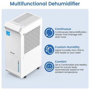 CONTROLE INTELIGENTE Os desumidificadores para casa param de funcionar ou reiniciam automaticamente quando o desumidificador atinge a umidade definida ou a umidade é maior que a umidade alvo. Design de controle inteligente, com leitura dos níveis de umidade, lembrete silencioso de balde cheio, desligamento automático, temporizadores de 24h, descongelamento automático, função de reinício automático para promover a conveniência para casa. Desfrute de um sono tranquilo e doce a noite toda.