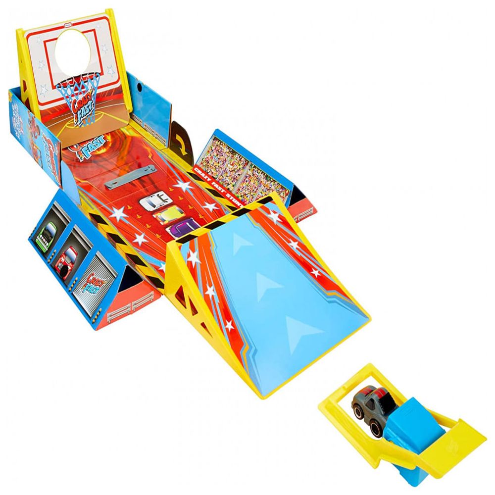 PLAYSET E PACOTE A caixa de embalagem resistente se desdobra em um playset exclusivo e pode ser para várias acrobacias e truques.