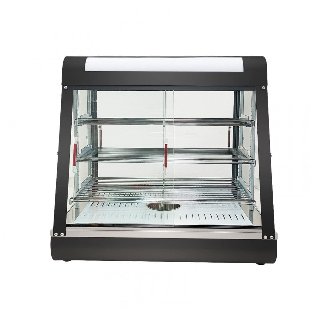 Atenção: Todos os produtos elétricos são 110V e necessitam de adaptador para a tomada no formato Brasileiro. O Expositor Aquecedor de Alimentos KOUWO 3 Prateleiras é um equipamento de bancada com estrutura em aço inoxidável, arame cromado e vidro transparente em quatro faces, projetado para exposição térmica controlada de lanches quentes em restaurantes, buffets e quiosques comerciais. Possui portas corrediças frontais e traseiras em vidro para acesso facilitado por clientes e abastecimento por equipe, além de três prateleiras internas que maximizam o espaço de exibição. A bandeja de água integrada na base mantém a umidade ambiente durante operação contínua. ? Equipado com iluminação interna para apresentação visual otimizada, o modelo opera em faixa de temperatura ajustável de 30°C a 85°C, com controle preciso via knob. A configuração em vidro reto frontal garante visibilidade total do conteúdo em 360 graus, enquanto a construção robusta suporta uso intensivo em cozinhas profissionais. Alimentado por energia elétrica corded com 110 Volts e 1200 W, oferece eficiência em espaços compactos de 66 cm de comprimento. ? Ficha Técnica Especificação Detalhes Marca KOUWO Cor Preto Material Aço Inoxidável, Arame Cromado, Vidro Dimensões (C x L x A) 66 cm x 49 cm x 64 cm Número de Prateleiras 3 Portas Frontal e Traseira Corrediças Bandeja de Água Integrada na Base Fonte de Energia Elétrica com Cabo Voltagem 110 Volts Potência 1200 W Temperatura Mínima 30°C Temperatura Máxima 85°C UPC 768488610349 Peso 40 kg
