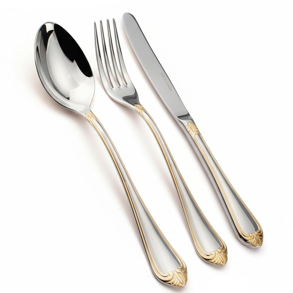 O design Victorian é uma homenagem à era da opulência, apresentando linhas formais e detalhadas que são a marca registrada da Fracalanza. O filete de ouro 24k realça os contornos do cabo de cada peça, criando um contraste visual que transforma o talher em uma joia.