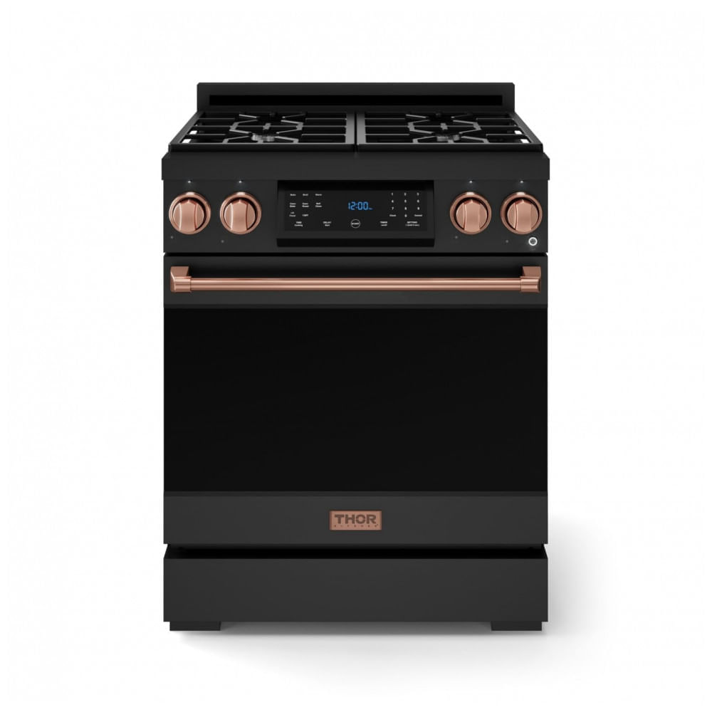 Atenção: Todos os produtos elétricos são 110V e necessitam de adaptador para a tomada no formato Brasileiro. O fogão a gás GLP profissional Thor Kitchen Gordon Ramsay 76cm em preto com detalhes em rose gold foi desenvolvido para uso residencial com desempenho de padrão profissional, reunindo forno a gás com convecção e mesa com queimadores selados. A combinação do acabamento preto fosco com puxadores e detalhes em rose gold valoriza projetos de cozinha contemporâneos, mantendo foco em robustez estrutural e controle preciso de chama. A mesa de cocção utiliza grelhas contínuas em ferro fundido que cobrem toda a superfície, permitindo movimentar panelas entre os queimadores sem necessidade de levantamento. Os queimadores duplos de alto desempenho oferecem potência máxima de 15.000 BTU e mínima de 650 BTU, possibilitando tanto cocção intensa quanto fervura suave e cozimento em fogo brando, adequados a diferentes técnicas de preparo. O forno a gás possui capacidade aproximada de 4,55 pés cúbicos, equivalente a cerca de 129L, oferecendo espaço interno suficiente para assadeiras grandes e preparo em múltiplos níveis. O queimador de assar com 18.500 BTU distribui calor de forma estável, enquanto o ventilador de convecção comercial melhora a circulação de ar quente no interior da cavidade, contribuindo para assados mais homogêneos. A função de grelha superior utiliza queimador de 10.000 BTU, adequada para grelhar, dourar e gratinar com aquecimento concentrado na parte superior dos alimentos. As prateleiras telescópicas, apoiadas em trilhos com esferas, facilitam o deslizamento para dentro e fora do forno, aumentando a segurança no manuseio de recipientes pesados e otimizando o acesso às assadeiras. A porta do forno possui janela panorâmica que permite acompanhar o cozimento sem abrir a porta, ajudando a manter a temperatura interna mais estável. O painel touch basculante conta com iluminação em luz branca projetada, facilitando a leitura das funções, enquanto os comandos reúnem recursos de timer, programação de tempo de cocção, início diferido, autolimpeza e modo sabbath. Ficha Técnica: Marca: Thor Kitchen Fabricante: Thor Kitchen Linha/Série: Gordon Ramsay Collection Tipo de produto: Fogão a gás GLP profissional de piso Tipo de instalação: Piso livre Tipo de combustível: Gás GLP (liquefeito de petróleo) Tipo de mesa: Queimadores a gás com grelha contínua Configuração do forno: Forno a gás com convecção Capacidade do forno: aproximadamente 129L Número total de queimadores na mesa: 4 queimadores a gás selados Potência queimador frontal esquerdo: 15.000 BTU Potência queimador frontal direito: 15.000 BTU Potência queimador traseiro esquerdo: 12.000 BTU Potência queimador traseiro direito: 12.000 BTU Potência do queimador de assar (bake): 18.500 BTU Potência do queimador de grelha superior (broil): 10.000 BTU Tipo de convecção: Convecção comercial com ventilador Modos de cocção do forno: Assar, assar com convecção, assar carne com convecção, grelhar, manter aquecido, pré-aquecimento rápido Recursos de controle do forno: Luz interna liga/desliga, relógio, timer de cozinha, cozimento programado por tempo, início diferido, autolimpeza, bloqueio de controle, modo sabbath Tipo de queimador: Selado Tipo de grelha da mesa: Grelhas contínuas em ferro fundido Cor: Preto com detalhes em rose gold Acabamento: Aço inoxidável e pintura em preto fosco Tensão: 110V Frequência: 60Hz Corrente nominal: 15A Tipo de plugue: Padrão de 3 pinos Controle do painel: Touch com painel basculante Tipo de comando: Manípulos frontais e tela touch Iluminação do painel: Luz projetada branca Iluminação interna do forno: Sim Quantidade de prateleiras internas: 2 Tipo de prateleiras: 1 grelha padrão e 1 grelha telescópica Função de limpeza: Autolimpeza Modo sabbath: Sim Tipo de gaveta inferior: Aquecimento, grelha e panificação Janela do forno: Janela panorâmica para visualização interna Altura aproximada: 91cm Largura aproximada: 76cm Profundidade aproximada: 74cm Peso do produto: 96kg Peso do pacote (produto + embalagem): 116kg Material principal: Aço inoxidável e ferro fundido Recursos adicionais: Painel touch basculante, grelhas contínuas, ventilador de convecção comercial, prateleira telescópica, funções de timer e início diferido Manual do usuário: Idioma inglês Conteúdo da embalagem: 1 fogão a gás GLP profissional 76cm, 1 grelha de forno padrão, 1 grelha telescópica, 1 conjunto de assadeira para grelha, 1 manual do usuário