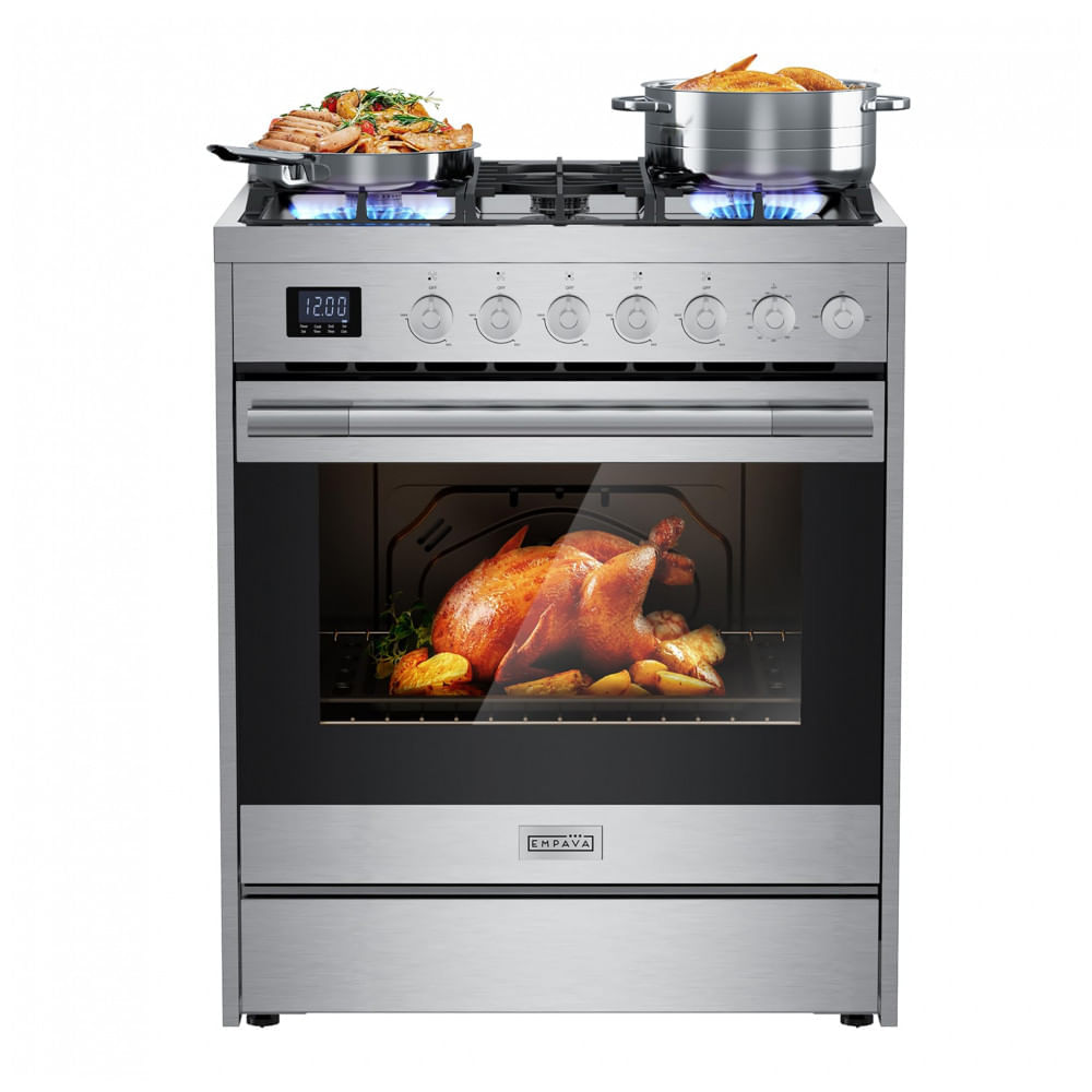 Atenção: Todos os produtos elétricos são 110V e necessitam de adaptador para a tomada no formato Brasileiro. O fogão a gás profissional Empava 76cm em aço inoxidável reúne forno a gás com convecção de 142L e mesa com cinco queimadores recuados selados, oferecendo configuração adequada para uso intenso em cozinhas residenciais. A construção em inox com grelhas contínuas em ferro fundido e gaveta inferior de armazenamento proporciona boa estabilidade para panelas grandes e organização de assadeiras e utensílios. A mesa de cocção conta com cinco queimadores de diferentes potências, incluindo queimador de 18.000 BTU para aquecimento rápido e selagem, queimadores intermediários de 8.800 BTU e 6.900 BTU para uso geral e queimador auxiliar de 5.000 BTU para simmer e cocção delicada. Os queimadores recuados ajudam a conter respingos na área da mesa, enquanto as grelhas contínuas formam uma superfície única que permite deslizar panelas entre as zonas de aquecimento sem a necessidade de levantá-las. O forno a gás com capacidade de aproximadamente 5,0 pés cúbicos (cerca de 142L) utiliza queimador inferior de 14.000 BTU e queimador superior de 8.500 BTU, com tecnologia de convecção que circula o ar quente por toda a cavidade para reduzir pontos frios. Esse sistema favorece assados mais homogêneos, preparo em múltiplos níveis e melhor controle de temperatura para assar, grelhar, desidratar e pré-aquecer. A porta do forno possui vidro temperado triplo com tecnologia Low-E, ajudando a reter calor na cavidade interna e fornecendo segurança térmica na parte externa. O interior conta com iluminação LED, uma grade de forno e uma bandeja, com cinco posições de suporte para ajuste de altura, permitindo acomodar desde assadeiras baixas até peças de maior volume, como assados de ocasião. O painel frontal combina manípulos mecânicos com timer digital em display touch, permitindo programar tempo de cocção de até 11 horas e 59 minutos. O fogão é configurado para gás natural, com opção de conversão para GLP via kit de bicos e acessórios dedicados, e a estrutura slide-in/freestanding com largura de cerca de 76cm facilita a instalação em nichos padrão de 30". Ficha Técnica: Marca: Empava Fabricante: Empava Modelo: 30GR06 Tipo de produto: Fogão a gás profissional de piso com forno único Tipo de instalação: Freestanding e slide-in Tipo de combustível: Gás natural (conversível para GLP com kit incluso) Tipo de mesa: Mesa a gás com 5 queimadores recuados selados Configuração do forno: Forno a gás com convecção Capacidade do forno: 142L Faixa de temperatura do forno: 60°C a 260°C Potência do queimador inferior do forno (bake): 14.000 BTU Potência do queimador superior do forno (broil): 8.500 BTU Potência do queimador inferior em HP: 0,54 HP Potência do queimador inferior em CV: 0,55 CV Número total de queimadores na mesa: 5 queimadores a gás Potência queimador triplo anel (alta potência): 18.000 BTU Potência queimador rápido: 8.800 BTU Potência queimadores semi-rápidos: 6.900 BTU (2 unidades) Potência queimador auxiliar: 5.000 BTU Potência queimador triplo anel em HP: 0,71 HP Potência queimador triplo anel em CV: 0,73 CV Tipo de grelha da mesa: Grelhas contínuas pesadas em ferro fundido Material da estrutura: Aço inoxidável Material das grelhas: Ferro fundido Cor: Inox Acabamento: Aço inoxidável escovado Tensão: 110V Frequência: 60Hz Corrente recomendada: 15A Função da alimentação elétrica: Ignição, ventilador de convecção, iluminação interna e painel de timer touch Controle do painel: Manípulos frontais e painel digital touch para timer Iluminação interna do forno: LED Tipo de porta do forno: Porta com vidro temperado triplo Low-E Quantidade de prateleiras internas: 1 grade de forno Posições de prateleira: 5 posições ajustáveis Bandejas internas: 1 bandeja de forno Gaveta inferior: Gaveta de armazenamento Largura do produto: 76cm Profundidade do produto: 63cm Altura do produto: 90cm Peso do produto: 81kg Peso do pacote (produto + embalagem): 89kg Conteúdo da embalagem: 1 fogão a gás 76cm, 1 grade de forno, 1 bandeja de forno, grelhas contínuas de mesa em ferro fundido, kit de conversão para GLP, manual do usuário Manual do usuário: Idioma inglês