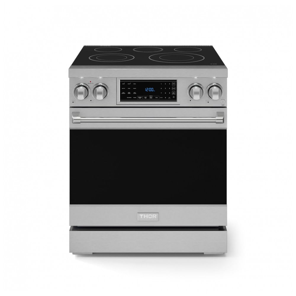 Atenção: Todos os produtos elétricos são 110V e necessitam de adaptador para a tomada no formato Brasileiro. O fogão elétrico de piso 76cm Thor Kitchen Gordon Ramsay em aço inoxidável com mesa vitrocerâmica oferece cinco zonas radiantes e forno elétrico de média capacidade, indicado para cozinhas residenciais planejadas com espaço padrão de 30". A superfície lisa em vidro cerâmico facilita o deslizamento de panelas, a limpeza após o uso e a visualização das áreas aquecidas. As zonas de aquecimento utilizam elementos radiantes sob o vidro, com potência mínima de 100W para aquecimento suave e manutenção de temperatura, chegando a elementos de 3000W para fervuras rápidas, frituras e preparos em alta temperatura. O conjunto de cinco elementos permite combinar simultaneamente funções como aquecer, ferver, grelhar e manter aquecido em diferentes recipientes. O forno elétrico possui capacidade de aproximadamente 129L, equivalente a 4,55 cu.ft., dimensionado para assadeiras grandes, assados de médio porte e múltiplas formas em uso simultâneo. O sistema de convecção verdadeira utiliza ventilador dedicado para distribuir o ar quente de forma uniforme, contribuindo para cocção mais homogênea em diferentes níveis. Além das funções de assar e convecção, o forno conta com grill elétrico de 3500W para gratinar e dourar rapidamente a superfície dos alimentos, bem como suportar modos de preparo que exigem calor concentrado na parte superior. As prateleiras incluem trilho telescópico, facilitando o acesso a assadeiras pesadas com movimento mais suave e seguro. O painel superior tipo tilt panel touch control agrupa os comandos da mesa e do forno em um painel digital inclinável, permitindo melhor leitura e ajuste de potência, temperatura, tempo e modos de cocção. A alimentação elétrica é em 220V, em configuração freestanding, sem necessidade de ligação a rede de gás, indicada para cozinhas que priorizam solução totalmente elétrica. Ficha Técnica: Marca: Thor Kitchen Fabricante: Thor Kitchen Modelo: RSE30 Tipo de produto: Fogão elétrico de piso com forno elétrico Tipo de instalação: Piso, freestanding Cor: Inox Acabamento: Aço inoxidável polido Material principal: Aço inoxidável e vidro cerâmico Material da mesa: Vidro cerâmico liso Número de zonas de aquecimento na mesa: 5 Tipo de elemento: Elementos radiantes elétricos sob vidro cerâmico Faixa de potência das zonas: De 100W a 3000W Potência máxima por elemento: 3000W Tipo de forno: Forno elétrico com convecção e grill elétrico Capacidade do forno: 129L Método de aquecimento do forno: Resistências elétricas com convecção forçada Funções do forno: Assar, convecção, grill, modos combinados de cocção Potência do elemento de bake: 3000W Potência do grill: 3500W Número de prateleiras: 2 (1 grade padrão e 1 trilho telescópico) Alimentação: Elétrica Voltagem: 220V Frequência: 60Hz Dimensões do produto (L x P x A): 74,7 cm x 75,7 cm x 91,4 cm Peso do produto: 91,2kg Peso do pacote (produto + embalagem): 115,7kg Controle do fogão: Tilt panel touch control superior Controle do forno: Painel touch com seleção de modos, temperatura e tempo Porta do forno: Porta com vidro para visualização interna Certificação: CSA Uso recomendado: Cozinhas residenciais planejadas que buscam fogão elétrico com mesa vitrocerâmica, forno de médio porte com convecção e grill de alta potência Conteúdo da embalagem: Fogão elétrico de piso 76cm, 1 grade de forno padrão, 1 trilho telescópico, 1 bandeja de grelha, 1 cesta para air fry, 1 sonda de carne, manual do usuário Manual do usuário: Idioma inglês