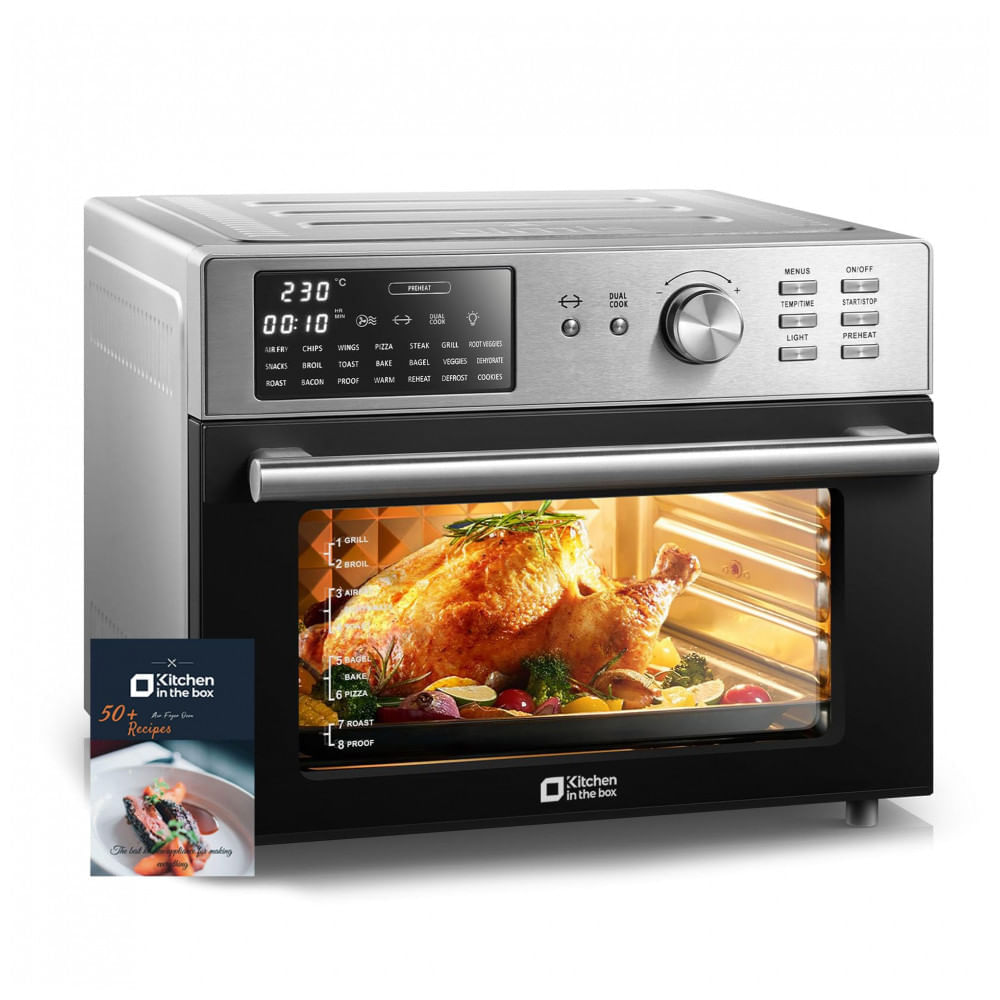 Atenção: Todos os produtos elétricos são 110V e necessitam de adaptador para a tomada no formato Brasileiro. O Kitchen in the box AF30N é um forno elétrico de bancada 32QT com função air fryer, projetado para uso familiar e capacidade para alimentos de maior volume, como pizzas de aproximadamente 33 cm, 4 a 6 fatias de torrada ou frango para espeto giratório em torno de 3,5 kg. O sistema de aquecimento de 1800W com 6 elementos e circulação de ar quente em 360° atua como forno de convecção, favorecendo cozimento rápido e distribuição uniforme de calor. A porta com vidro duplo reduz perdas térmicas, ajudando a manter a temperatura interna estável e a aumentar a eficiência. ? O equipamento oferece 21 funções pré-programadas que contemplam modos como Air Fry, Bake, Toast, Roast, Broil, Warm, Reheat, Proof e Dehydrate, entre outros, permitindo selecionar automaticamente combinações de tempo e temperatura. A função Dual Cook possibilita combinar dois modos de cocção na mesma programação, aplicando sequências como assar e depois dourar, por exemplo. O controle é feito por knob e botões frontais, com ajuste de temperatura em incrementos de aproximadamente 3 °C dentro de uma faixa de cerca de 32 °C a 232 °C. ? A tecnologia de circulação de ar quente contribui para redução de uso de óleo em comparação a frituras por imersão, mantendo crocância externa e interior úmido. O forno possui cavidade com múltiplas posições de prateleira (até 4 níveis), permitindo ajustar a altura de assadeiras, cestos e espetos de rotisserie. O conjunto é indicado para assar, grelhar, tostar, desidratar e aquecer alimentos em bancada de cozinha residencial. Ficha Técnica: Marca: Kitchen in the box Fabricante: Kitchen in the box Modelo: AF30N Nome comercial: Kitchen in the box 32QT Extra Large Air Fryer Toaster Oven Combo Tipo de produto: Forno elétrico de bancada com air fryer, convecção e rotisserie Cor: Prata (silver) Capacidade aproximada: 32 QT (aprox. 30 L) Dimensões do produto (P x L x A): 40,1 cm x 45,2 cm x 34,0 cm Material da porta: Vidro temperado e aço inoxidável Estilo de porta: Porta frontal basculante (dropdown door) Número de prateleiras/níveis: Até 4 posições internas de prateleira Sistema de aquecimento: 6 elementos de aquecimento com convecção de ar quente em 360° Elementos especiais: Elementos de aquecimento infravermelhos (infrared heating elements) Potência: 1800W Voltagem: 110V Frequência: 60 Hz Faixa de temperatura aproximada: 32 °C a 232 °C Incremento de ajuste de temperatura: Aproximadamente 3 °C (ajuste em passos equivalentes a 5 °F) Funções principais: Air fry, assar (bake), tostar (toast), dourar (broil), grelhar/roast, manter aquecido (warm), reaquecer (reheat), fermentar (proof), desidratar (dehydrate) Número de presets: 21 funções pré-programadas Função Dual Cook: Combinação de dois modos de cocção na mesma programação Tecnologia de circulação: Ventilador de convecção para fluxo de ar quente em 360° Redução de gordura: Projeto voltado a uso reduzido de óleo em comparação a fritura tradicional Tipo de controle: Knob de seleção e botões de ajuste Fonte de alimentação: Elétrica Acessórios (conforme fabricante): Conjunto de 6 acessórios (por exemplo, grelha, bandeja, cesto de air fryer, espeto de rotisserie e outros, conforme kit incluso) Uso recomendado: Air fryer, forno de convecção, rotisserie e desidratador em cozinhas residenciais Peso do produto: 12,9 kg Manual do usuário: Inglês
