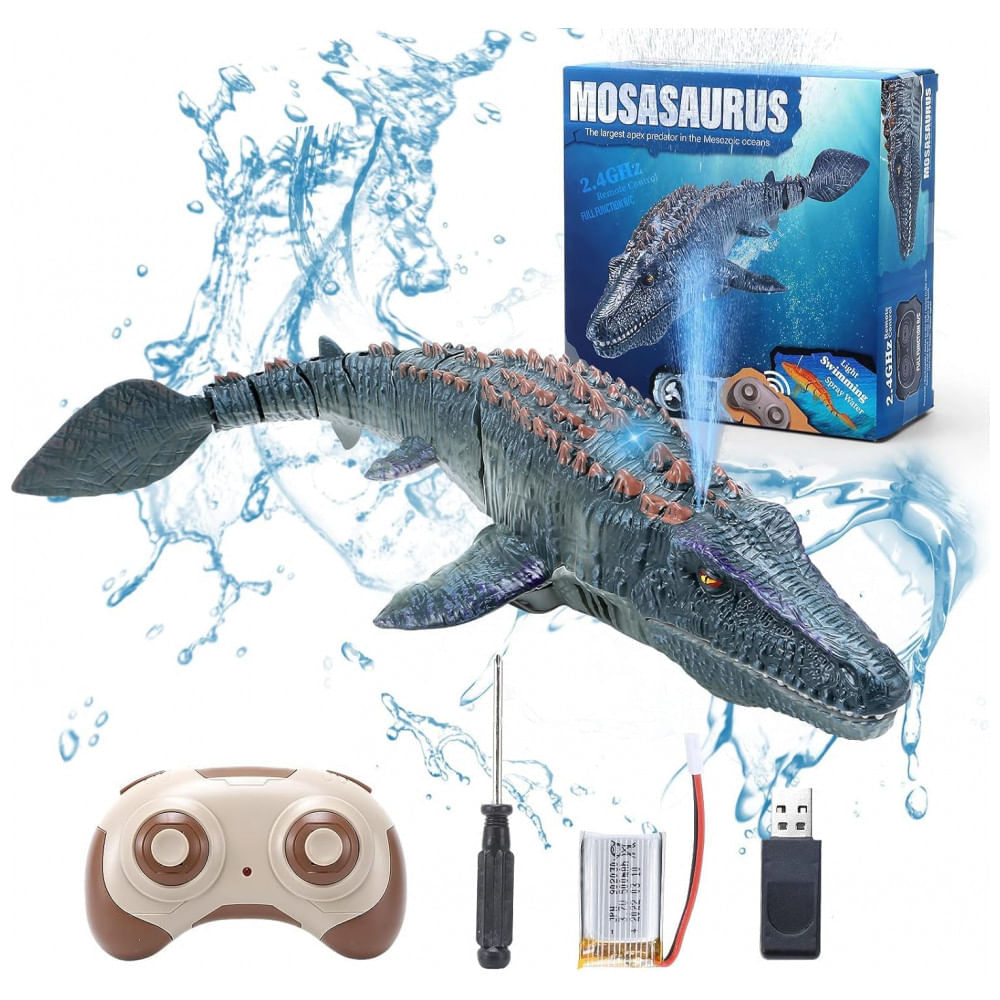 Atenção: Todos os produtos elétricos são 110V e necessitam de adaptador para a tomada no formato Brasileiro. Descubra a emoção de controlar o Mosasaurus, o maior predador marinho do período Cretáceo, com este brinquedo remoto realista da fromeasy. Este dinossauro aquático possui um corpo aerodinâmico e articulações flexíveis na cauda, permitindo movimentos naturais para a esquerda e direita, proporcionando uma experiência de imersão total. Equipado com uma bateria recarregável de lítio de 3,7V e 500mAh, ele pode nadar por até 20 minutos após 60 minutos de carga via cabo USB incluso. Controle suas aventuras com tecnologia de controle remoto 2.4GHz, que oferece controle completo de frente, ré, movimentos laterais e velocidades variadas, com alcance sem fio de até 50 metros. Além disso, o Mosasaurus conta com luzes e função de spray de água, aumentando a diversão, especialmente em ambientes escuros ou ao entardecer. O brinquedo é ideal para crianças a partir de 3 anos e também é um presente perfeito para aniversários e Natal, graças ao seu design detalhado e pintura artesanal. Nota importante: a bateria do controle remoto não está inclusa e requer 2 pilhas AAA. Para garantir o melhor desempenho, recomenda-se carregar totalmente o brinquedo antes do uso e proteger o controle remoto da água. Especificações: Dimensões do produto: 19,5 x 19,4 x 8,4 cm, Peso do item: 448 gramas, Número do modelo: 3712-1A, Idade recomendada pelo fabricante: 3 anos ou mais, Fabricante: fromeasy