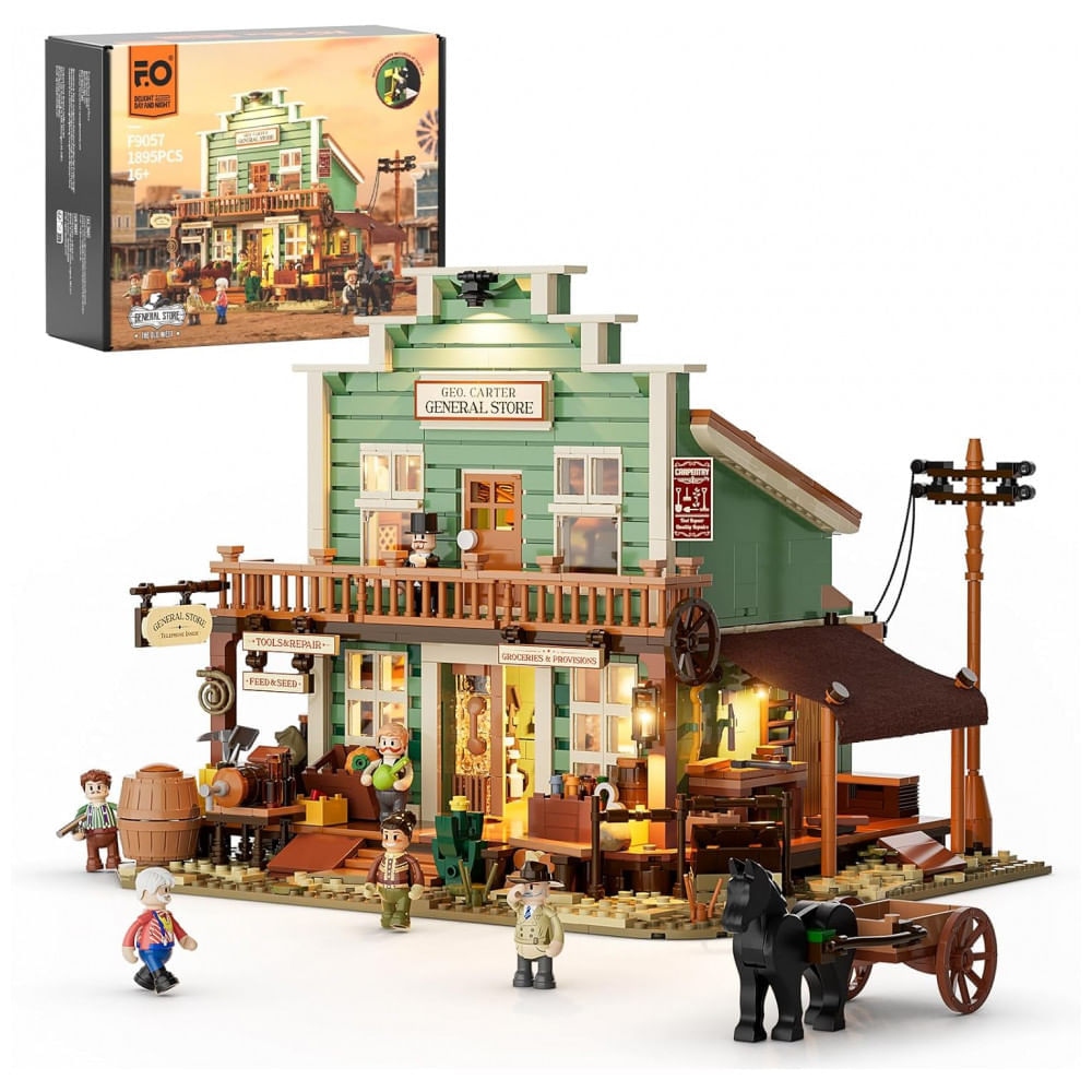 Atenção: Todos os produtos elétricos são 110V e necessitam de adaptador para a tomada no formato Brasileiro. Conjunto de blocos de montar em plástico que reproduz uma loja geral típica de cidade do Velho Oeste, com fachada detalhada, plataforma de madeira frontal e pavimento superior tipo sótão. A construção retoma elementos arquitetônicos do século XIX, como estrutura em madeira, marquise frontal e dois níveis voltados para a rua principal. O interior é organizado como ponto central de comércio da cidade, com balcão, estantes, barris, caixas, frutas, legumes e utensílios variados, simulando um armazém completo. A edificação inclui ainda área de trabalho com bancada, fogão a querosene, telefone, espaço de apoio e um cômodo oculto, permitindo criar cenas de abastecimento, serviços e convivência. A estrutura foi projetada para exposição, com parede removível e cobertura destacável que facilitam o acesso visual aos ambientes internos e a reorganização de móveis e personagens. O conjunto acompanha diferentes figuras, como comerciante, auxiliar, trabalhador ferroviário, agricultor, garimpeiro e detetive, ampliando as possibilidades de narrativa no cenário western. O sistema de iluminação por LED distribui pontos de luz em áreas internas e externas, destacando a placa frontal, a varanda e zonas internas da loja. O produto é voltado para adultos, com grande quantidade de peças, alto nível de detalhamento e montagem indicada para exposição em coleções temáticas de Velho Oeste. Ficha Técnica: Marca: Funwhole Fabricante: Funwhole Modelo: Western General Store F9057-MT Tema: Loja geral de cidade do Velho Oeste Faixa etária recomendada: Adulto / a partir de 16 anos Material: Plástico Quantidade de peças: 1895 peças Tipo de bloco: Blocos de montar interligáveis Estrutura: Prédio de dois andares com plataforma de madeira frontal, interior mobiliado e sótão Sistema de iluminação: Kit de LED com pontos de luz internos e externos Recursos internos: Balcão, estantes, fogão a querosene, bancada de trabalho, telefone, depósito e cômodo oculto Personagens inclusos: Comerciantes e moradores, incluindo trabalhador ferroviário, agricultor, garimpeiro e detetive Dimensões do produto montado (C x L x A): 32 cm x 24 cm x 25 cm Dimensões da embalagem (C x L x A): 25,5 cm x 30,5 cm x 25 cm Peso do produto: 3,07 kg Peso do pacote (produto + embalagem): 3,3 kg Voltagem: Não se aplica Conteúdo da caixa: Blocos de montar, kit de iluminação LED e manual de instruções Manual do usuário: Inglês