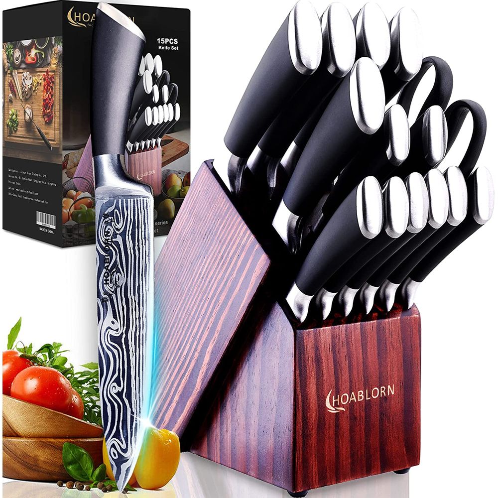 Produto importado dos Estados Unidos o prazo de entrega e de ate 25 dias uteis As importacoes sao oficiais atraves do Regime de Tributacao Simplificada da Receita Federal O preco inclui imposto de Importacao ICMS Frete Nacional Frete Internacional Servicos Alfandegarios e a intermediacao de cambio para pagamento no exterior O preco ja inclui todos os custos nao sera cobrado nenhum valor extra para o recebimento do produto ATENCAO Todos os produtos eletricos sao 110V e necessitam de adaptador para a tomada no formato brasileiro Conjuntos de facas de cozinha ou presentes perfeitos Cada faca hoablorn e cuidadosamente forjada o bloco de faca de madeira tambem e construido pacientemente E adequado nao apenas para cozinhas familiares comuns mas tambem para chefs Alem do mais a aparencia classica e combinada com padrao Laser Damasco em caixa de embalagem requintada Estes fazem um presente tao impressionante para o casamento de inauguracao Dia dos Pais Dia das Maes Acao de Gracas etc O conjunto de facas HOABLORN testemunharia sua amizade carinho e amor Conjunto de facas completo com bloco O conjunto de facas Damasco com bloco inclui 15 pecas faca de chef faca de pao faca de fatiar faca santoku faca de desossar faca universal faca de frutas faca serrilhada de 6 pecas uma tesoura de cozinha e belo bloco de faca de madeira O bloco de madeira tem uma construcao mais afiada e muito conveniente para afiar a faca Conjuntos de facas de aco inoxidavel Nossas facas Damasco sao feitas de aco alemao de alto carbono X50Cr15 de alta qualidade E mais duravel resistente ao desgaste afiada e nao enferruja e essas facas sao muito pesadas e podem ser controladas em tarefas de precisao