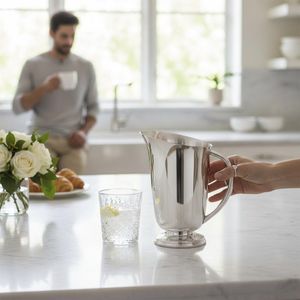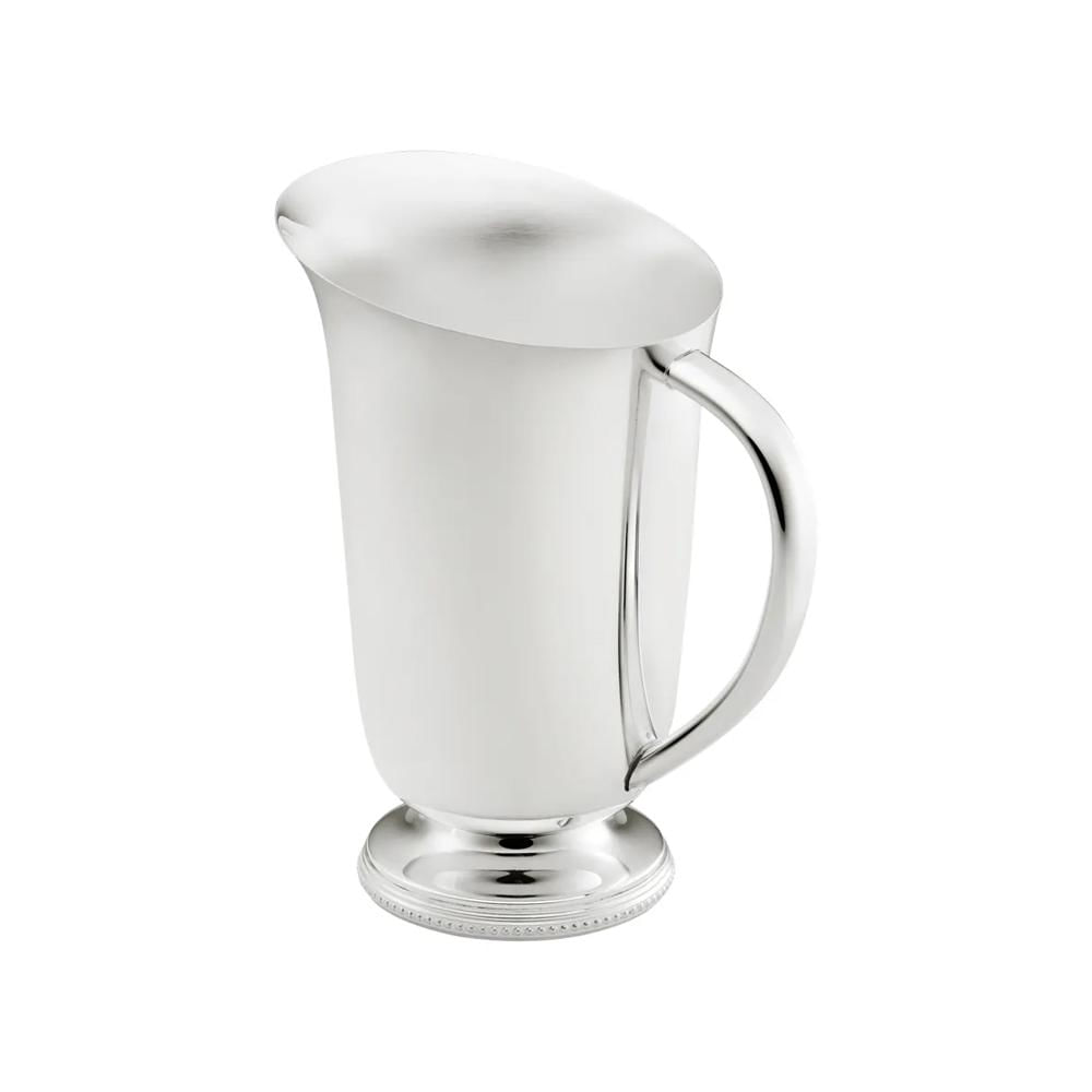A Jarra Bloom Prata possui um design belo e delicado, ideal para servir suas bebidas leves com requinte e elegância. Ela se destaca pelos detalhes pérola artesanalmente gravados em sua borda e pé, adicionando um charme clássico e atemporal à sua mesa.