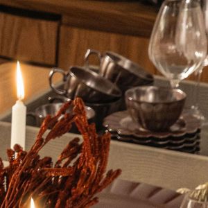 Adquira agora o Jogo de Xícaras de Chá Flora Anis e leve o aconchego e a modernidade do acabamento metalizado para a sua pausa!