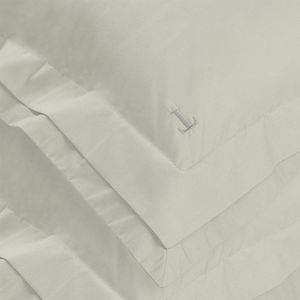 Acabamento: Fronhas com 4 abas duplas e bordado monograma “T”, sobre lençol com dobra feita, lençol com elástico