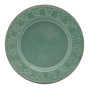 A aba dos pratos se destaca com uma decoração em alto-relevo, que remete aos arabescos elegantes da arte da henna. A cor Malaquita é inspirada na pedra de mesmo nome, conhecida por sua tonalidade verde exuberante e seu poder de equilibrar ambientes. Detalhes finais em filetes marrons decoram a borda de cada peça.