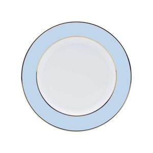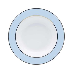 O design é marcado pela aba larga do formato Flamingo, que recebe uma decoração bicolor em um suave tom de azul e um delicado filete em ouro. Essa combinação confere à louça um brilho sutil, ideal para ocasiões especiais.