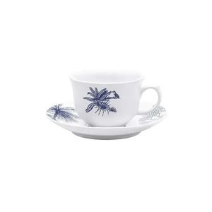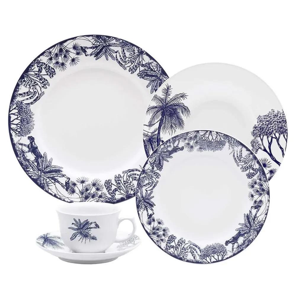 Nesta releitura, a cena campestre é substituída por um cenário exótico: plantas típicas do Brasil, onças e tucanos formam a estampa que decora a aba dos pratos e xícaras. O resultado é um visual sofisticado com a alegria e a exuberância do nosso país.