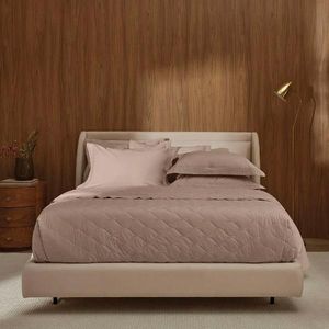 O bordado em duas cores da cama Scarpe aplicado na aba, é a representação dos caminhos de Bérgamo, suas ruas e texturas. Versátil, se apresenta em uma versão contemporânea e outra clássica, denotando autenticidade. Dobra feita com entremeio bordado, Lençol com elástico